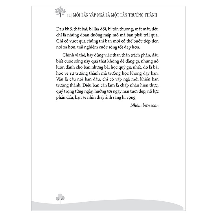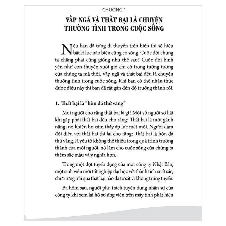 Nhưng mong bạn suy nghĩ kĩ, mỗi khi bạn gặp phải khó khăn hoặc vấp ngã, ngoài việc cảm thấy đau khổ về mặt tinh thần, bạn còn học được điều gì? Tôi dám khẳng định rằng bạn đã có được kinh nghiệm, và khi đã lĩnh hội, bạn sẽ không vấp ngã lại nơi bạn đã từng ngã. Đây chính là sự trưởng thành.