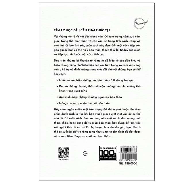 Mood Book – Đọc vị cảm xúc Công ty phát hành: Thái Hà Tác giả: Andrea Harrn Dịch giả: Phạm Quang Văn Số trang: 252 trang Khổ: 14x20cm Nhà xuất bản: Lao Động Tâm lý học đâu cần phải phức tạp Với những mô tả về nét đặc trưng của 100 tâm trạng, cảm xúc, cảm giác, trạng thái tinh thần và các tật trong tính cách, cùng với một vài rối loạn khí sắc, cuốn sách này đem đến một cách tiếp cận gần gũi để bạn có thể hiểu bản thân, thách thức lối tư duy của mình và tiếp tục tiến bước theo một cách tích cực. Dựa trên những lời khuyên rõ ràng và dễ hiều về các dấu hiệu và triệu chứng, về việc những tâm trạng và cảm xúc biểu hiện ra ngoài như thế nào, đồng thời cả sự hỗ trợ và định hướng trong việc đối phó với chúng, bạn có thể học cách: