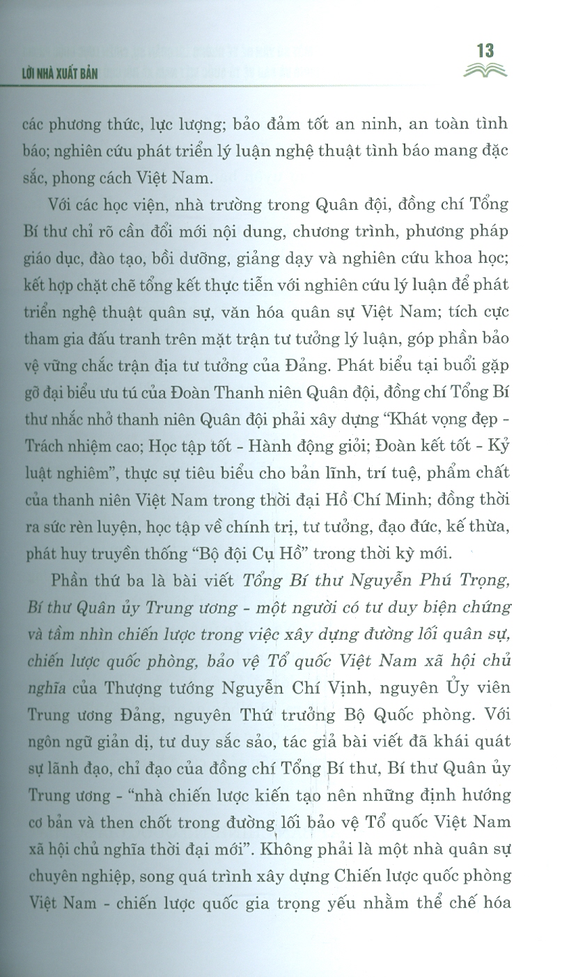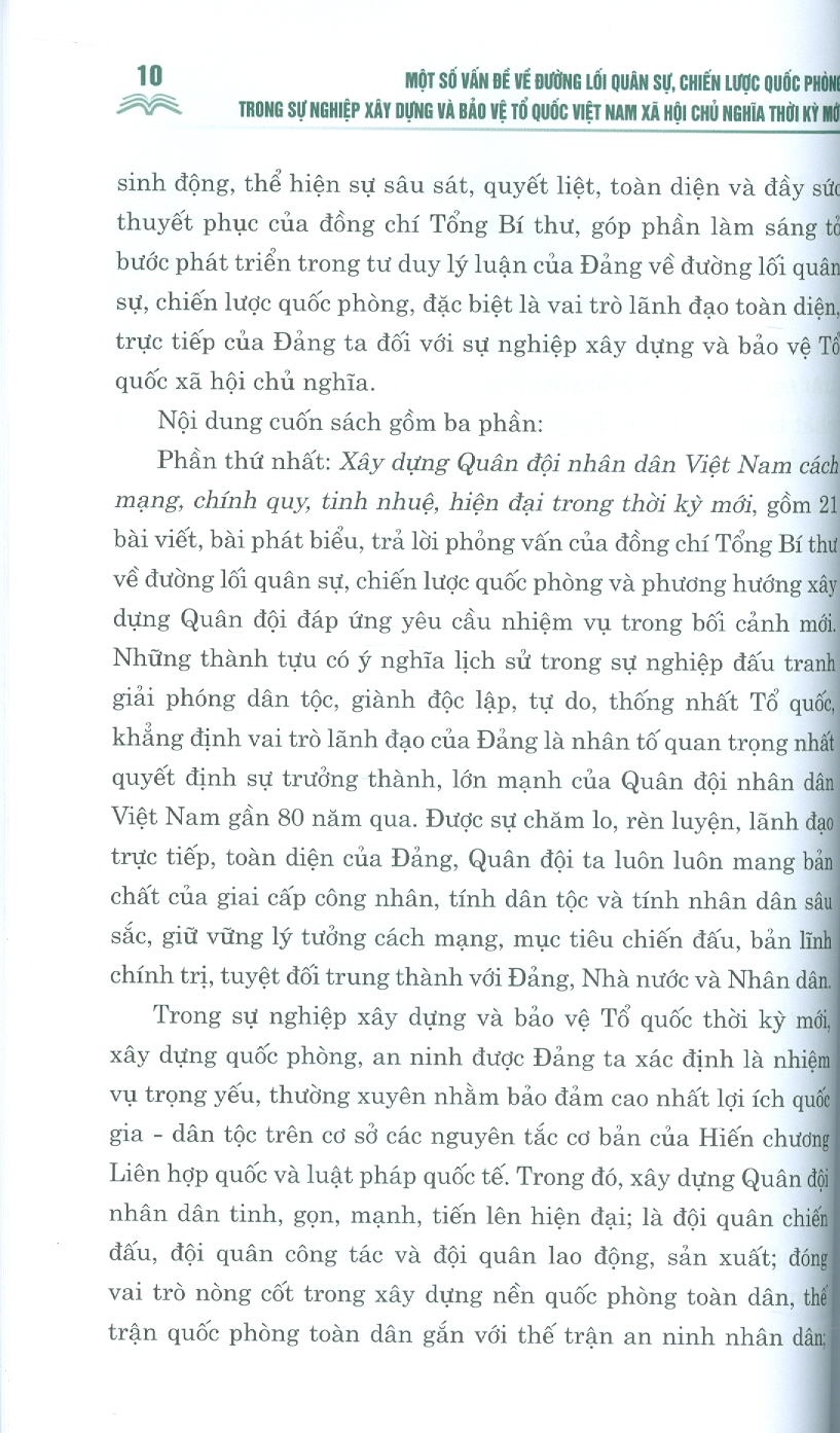 Cuốn sách gồm 39 bài viết, bài phát biểu, trả lời phỏng vấn của đồng chí Tổng Bí thư Nguyễn Phú Trọng, Bí thư Quân ủy Trung ương, thể hiện tư tưởng nhất quán, xuyên