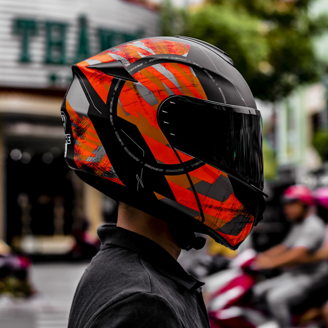 Phần hàm có thể lật lên 90 độ để biến chiếc mũ từ fullface thành mũ 3/4 khi đi nội thành. Với phần chốt hàm được thiết kế bên dưới cùng với đệm cằm mang lại tính thẩm mỹ cao.