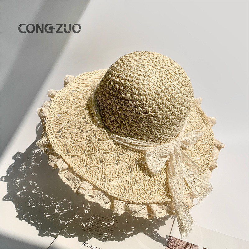 Mũ cói rơm vành phẳng nữ mùa hè phiên bản Hàn Quốc chống nắng UV cho kỳ nghỉ Nón đi biển Paris thời trang hàng đầu Pháp Chất liệu cói