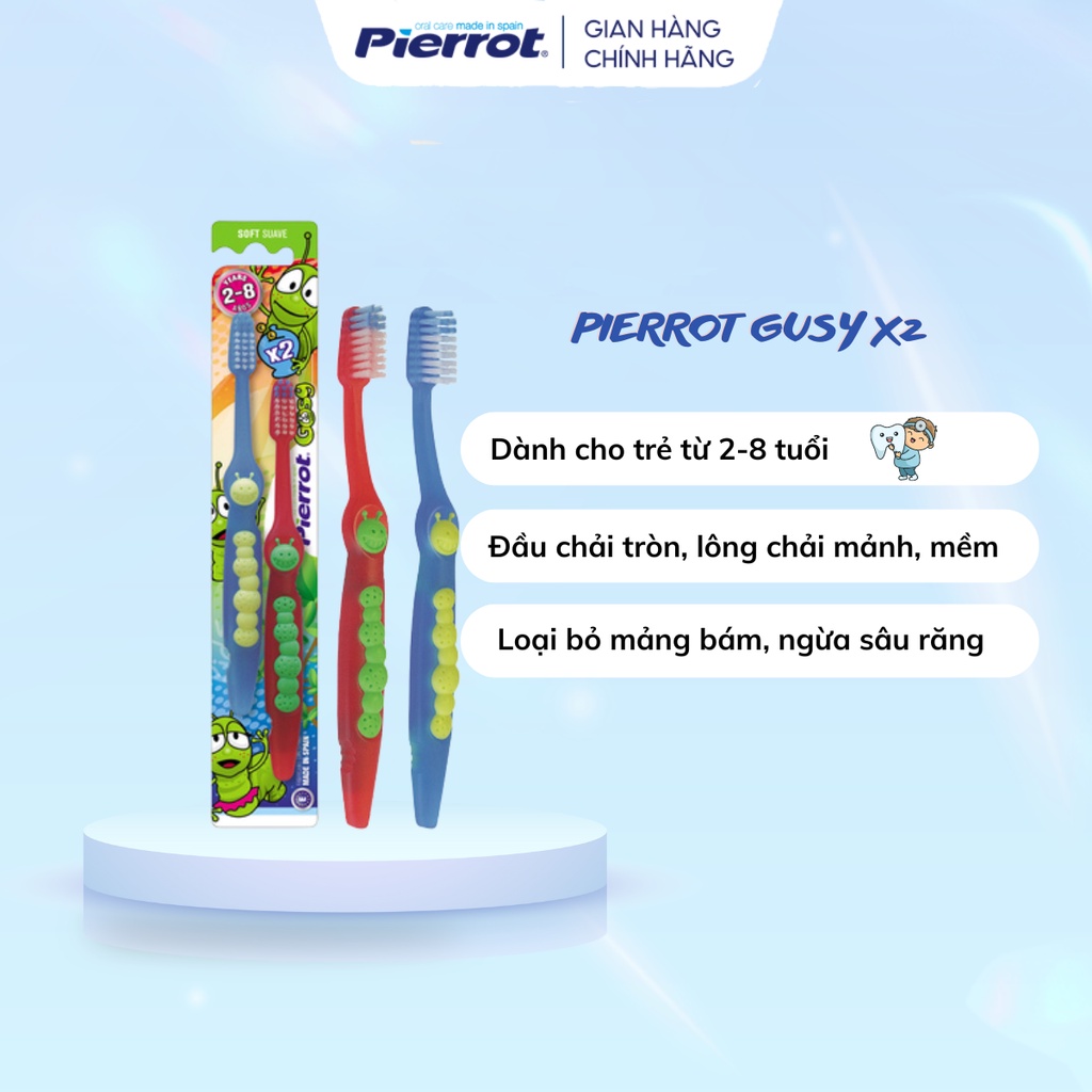 Bộ đôi bàn chải đánh răng trẻ em siêu mềm PIERROT GUSY X 2 được thiết kế đầu chải nhỏ gọn, lông bàn chải mảnh và mềm dễ dàng làm sạch các kẽ và chân răng, loại bỏ mảng bám thức ăn, ngăn ngừa sâu răng, bảo vệ răng và nướu lợi suốt 24 tiếng, cho răng chắc khỏe, sáng bóng .