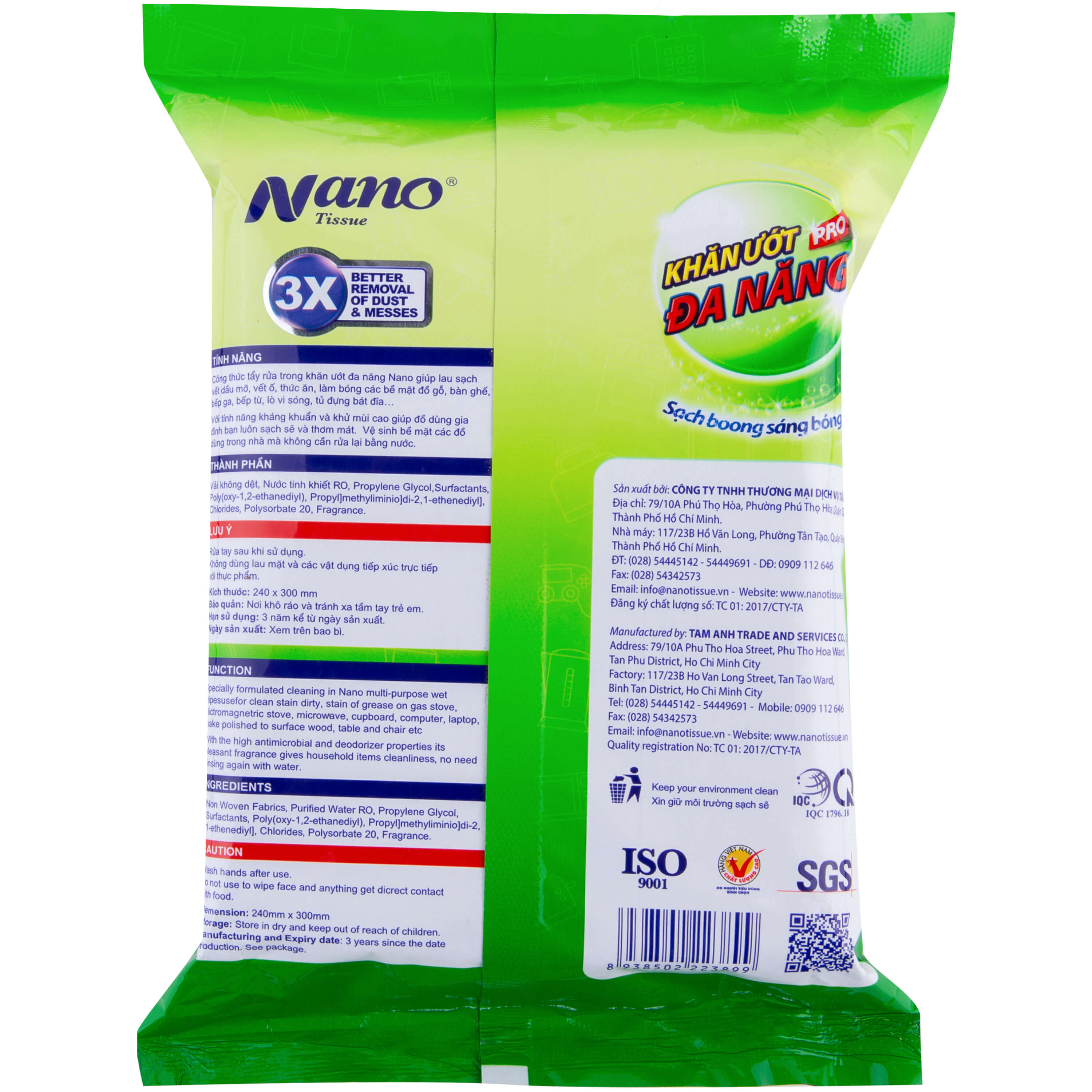 Mô tả sản phẩm Thương hiệu: Nano 30 tờ/ túi KHĂN ƯỚT ĐA NĂNG NANO – KHÔNG CÒN PHẢI QUÁ NHỌC CÔNG. Với các tính năng vượt trội Khăn ướt đa năng sẽ mang đến nhiều tiện ích bất ngờ cho người nội trợ.