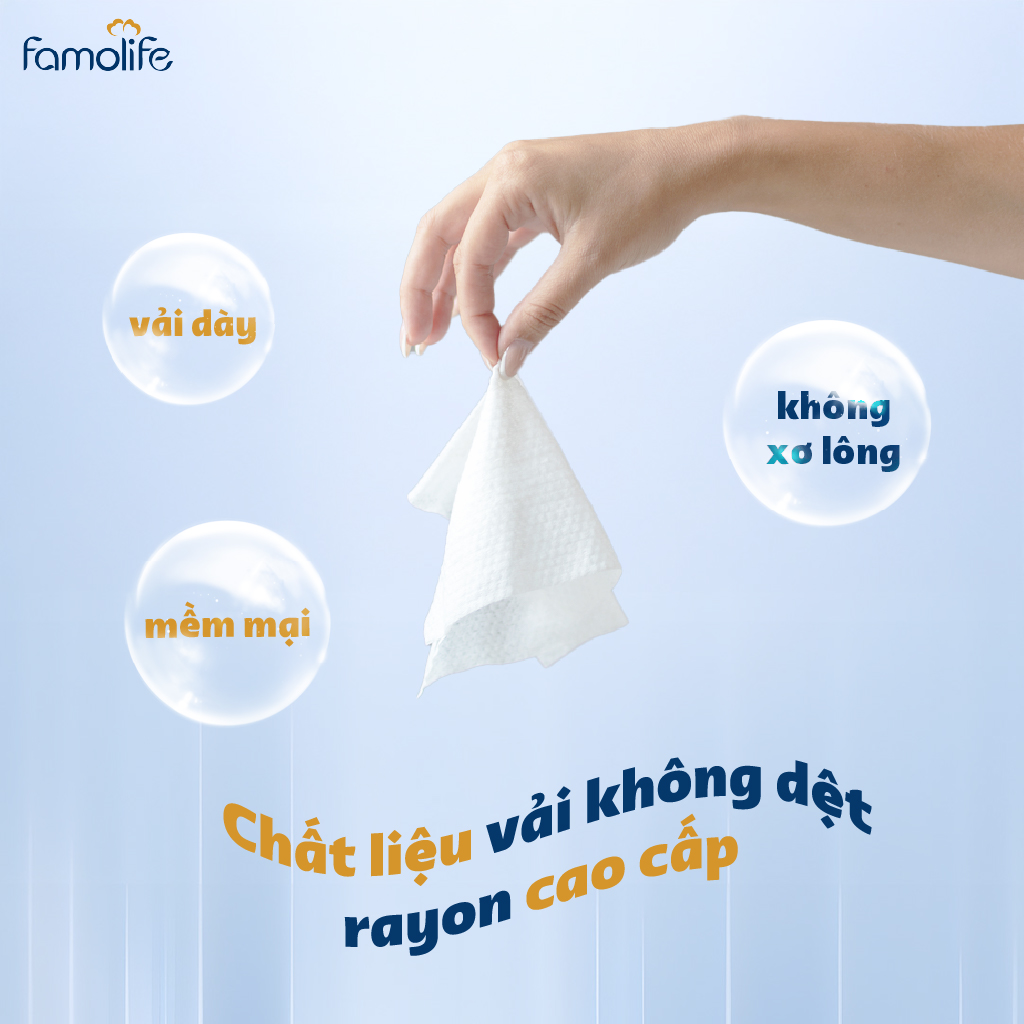 Được làm từ sợi vải không dệt, rất dai, mềm, mịn và có độ đàn hồi cao. Dạng khô, thích hợp cho làn da nhạy cảm nhất. An toàn cho bé, tiết kiệm cho mẹ.