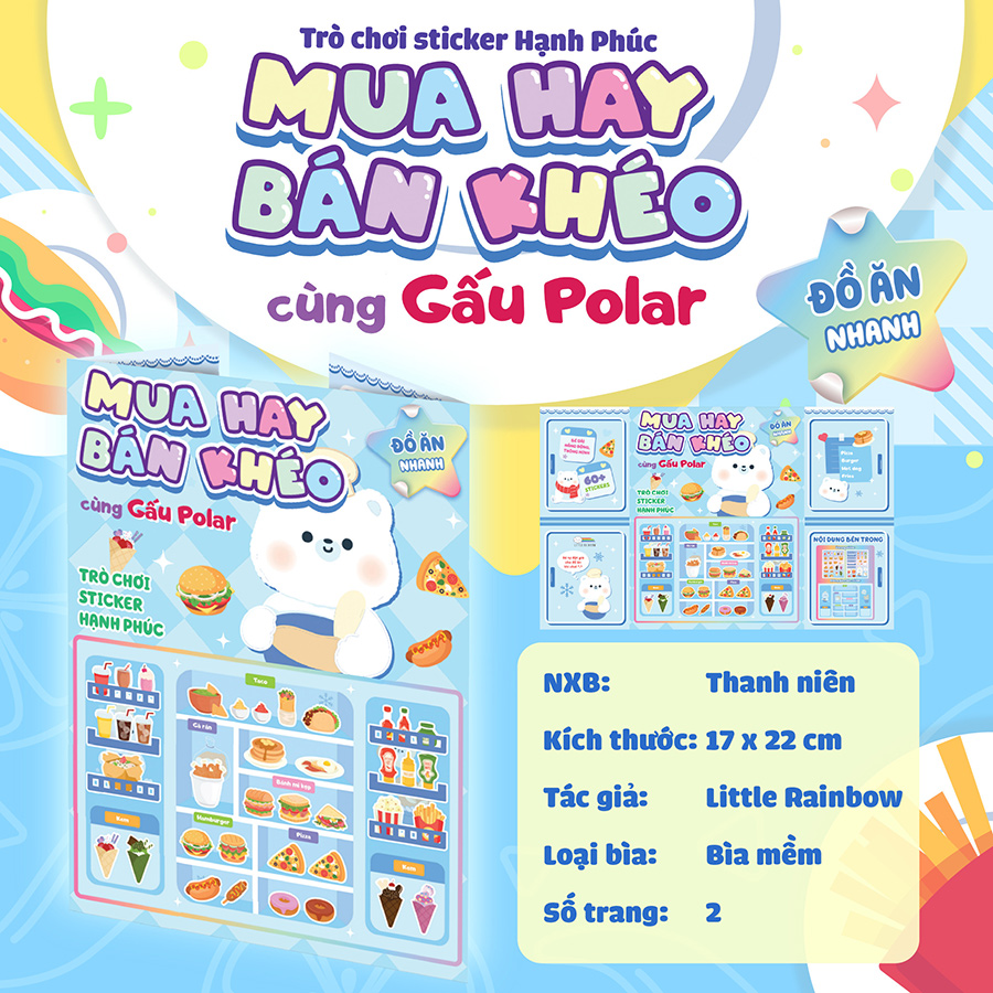 Mua hay bán khéo gồm 5 tập khác nhau với gian hàng khác nhau cùng các bạn Gấu, Thỏ, Vịt. Mỗi tập bao gồm 60+ stickers an toàn và siêu đáng yêu. 5 tập này sẽ là người bạn đồng hành tuyệt vời cho sự sáng tạo và trí tưởng tượng của các bé.