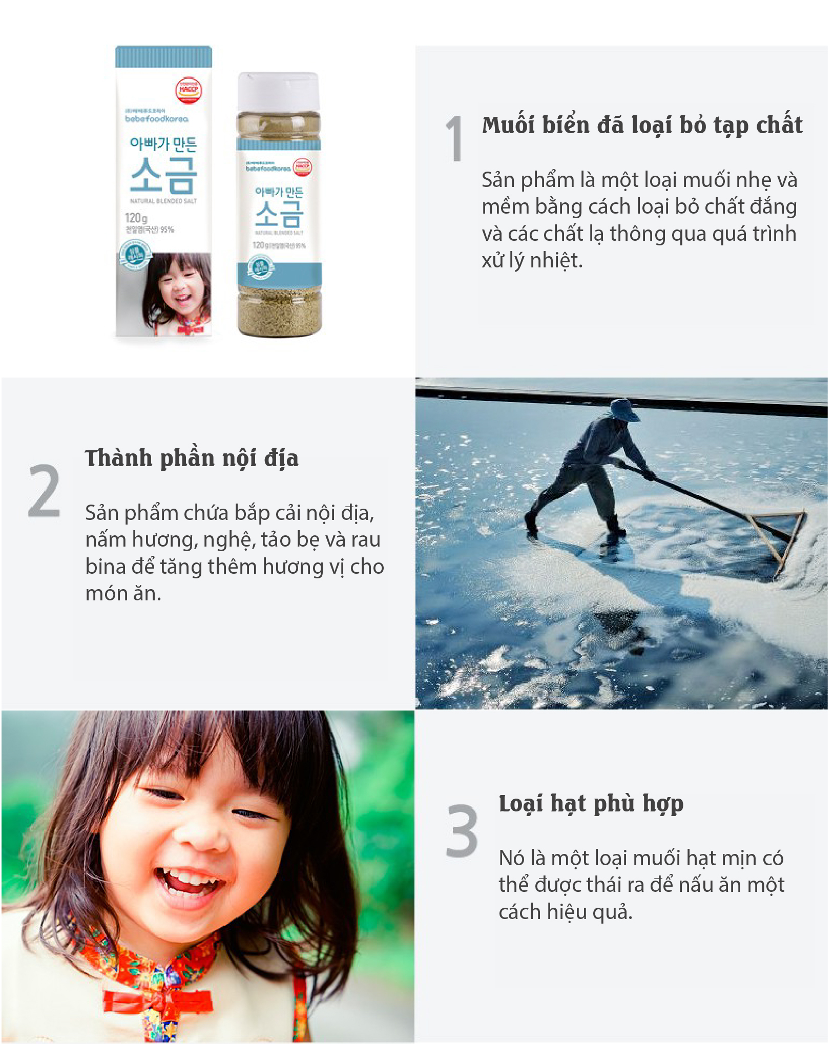 Muối ăn dặm cho bé Bebefood Hàn Quốc Muối do cha đẻ của Bebefood làm ra là loại muối sạch và tốt cho sức khỏe bằng cách loại bỏ các chất đắng và lạ từ muối biển tự nhiên của vùng Muan, Jeollanam-do, rất giàu chất dinh dưỡng. Với việc bổ sung bột rau nội địa Hàn có thể làm tăng hương vị của thức ăn với một lượng nhỏ nên có thể sử dụng đa dạng trong việc nấu ăn cho trẻ. Muối biển đã loại bỏ tạp chất Sản phẩm là một loại muối nhẹ và mềm bằng cách loại bỏ chất đắng và các chất lạ thông qua quá trình xử lý nhiệt.