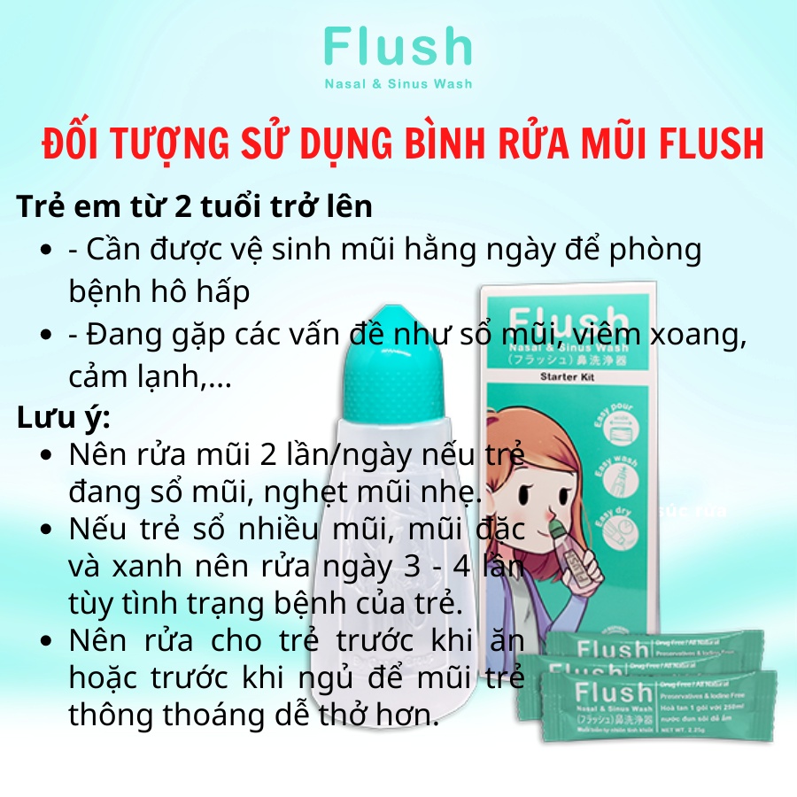 - Làm sạch, dưỡng ẩm và làm dịu các vùng mô mũi bị kích thích. SẢN PHẨM MUỐI RỬA MŨI FLUSH SỬ DỤNG CÙNG BÌNH RỬA MŨI FLUSH Bước 1: Rửa tay và bình rửa mũi sạch sẽ trước khi sử dụng Bước 2: Cắt gói muối sinh lý và đổ vào bình Bước 3: Rót nước cất, nước lọc hoặc nước đun sôi để ấm vào bình ở mức 250ml. Bước 4: Vặn chặt nắp bình và lắc cho muối tan hết. Bước 5: Cúi người, nghiêng đầu trước bồn rửa, nhẹ nhàng đưa đầu có lỗ trên nắp bình vào mũi Bước 6: Há miệng, nhẹ nhàng bóp chai theo từng nhịp. Bước 7: Lặp lại với bên mũi còn lại khi dung dịch còn một nửa. Cảm ơn quý khách đã tin tưởng và lựa chọn sản phẩm bình rửa mũi của FLUSH NASAL