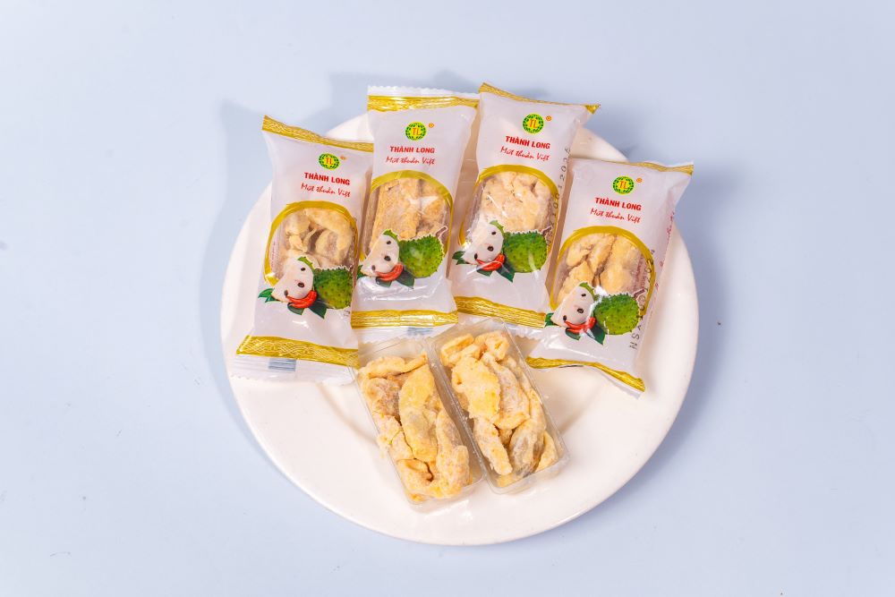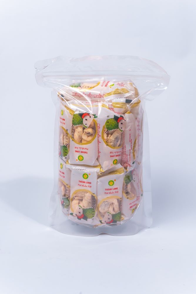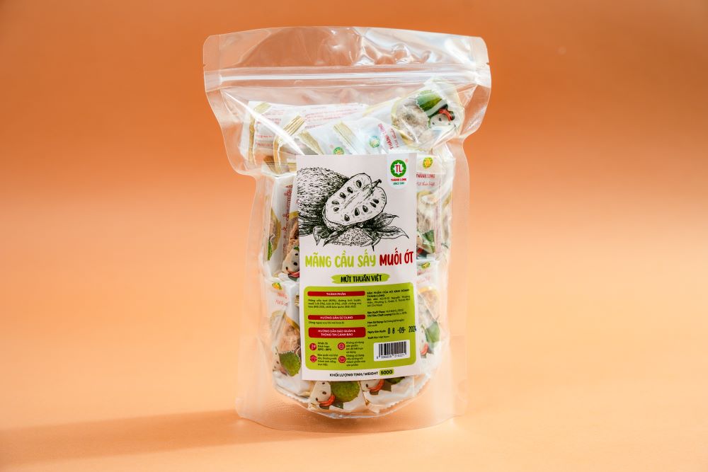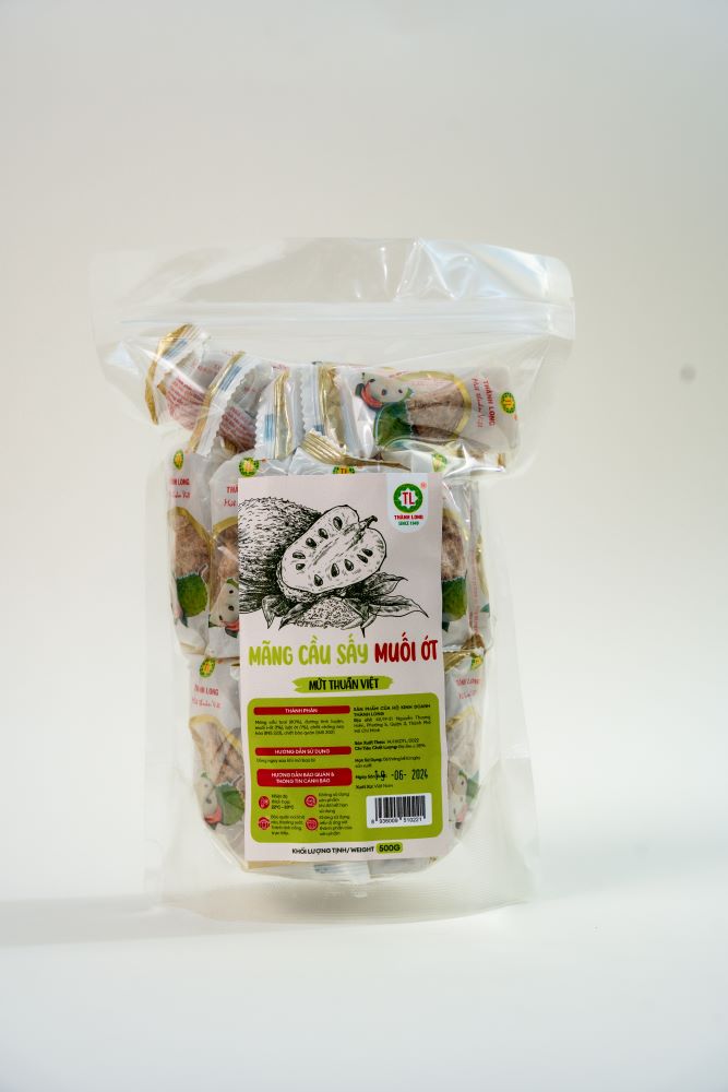 SẢN XUẤT TẠI HỘ KINH DOANH THÀNH LONG ĐỊA CHỈ : 42/19-21 NGUYỄN THƯỢNG HIỀN, PHƯỜNG 5, QUẬN 3, THÀNH PHỐ HỒ CHÍ MINH MÃNG CẦU SẤY MUỐI ỚT MỨT THUẦN VIỆT Thời hạn sử dụng: 06 tháng kể từ ngày sản xuất THÀNH PHẦN : Mãng cầu tươi (80%), đường tinh luyện, muối i-ốt, bột ớt, chất chống oxy hóa (E223), chất bảo quản (E202) SẢN XUẤT THEO : 14/HKDTL/2020 CHỈ TIÊU CHẤT LƯỢNG: Độ ẩm ≤ 35 % HƯỚNG DẪN SỬ DỤNG VÀ BẢO QUẢN: HƯỚNG DẪN SỬ DỤNG : Dùng ngay sau khi mở bao bì. HƯỚNG DẪN BẢO QUẢN : Bảo quản nơi khô ráo, thoáng mát. Tránh ánh nắng trực tiếp. Nhiệt độ thích hợp: 22℃-30℃ THÔNG TIN CẢNH BÁO : Không sử dụng sản phẩm khi đã hết hạn sử dụng. NHÃN HIỆU ĐĂNG KÝ BẢO HỘ ĐỘC QUYỀN 60933 CẤP THEO QĐ Số A1994/QĐ-ĐK, NGÀY :10.03.2005 Giấy chứng nhận ISO 22000:2007/ISO 22000:2005 số 18.2177 – FSMS do Trung tâm Giám định và chứng nhận hợp chuẩn hợp quy - VietCert đánh giá chứng nhận phù hợp tiêu chuẩn