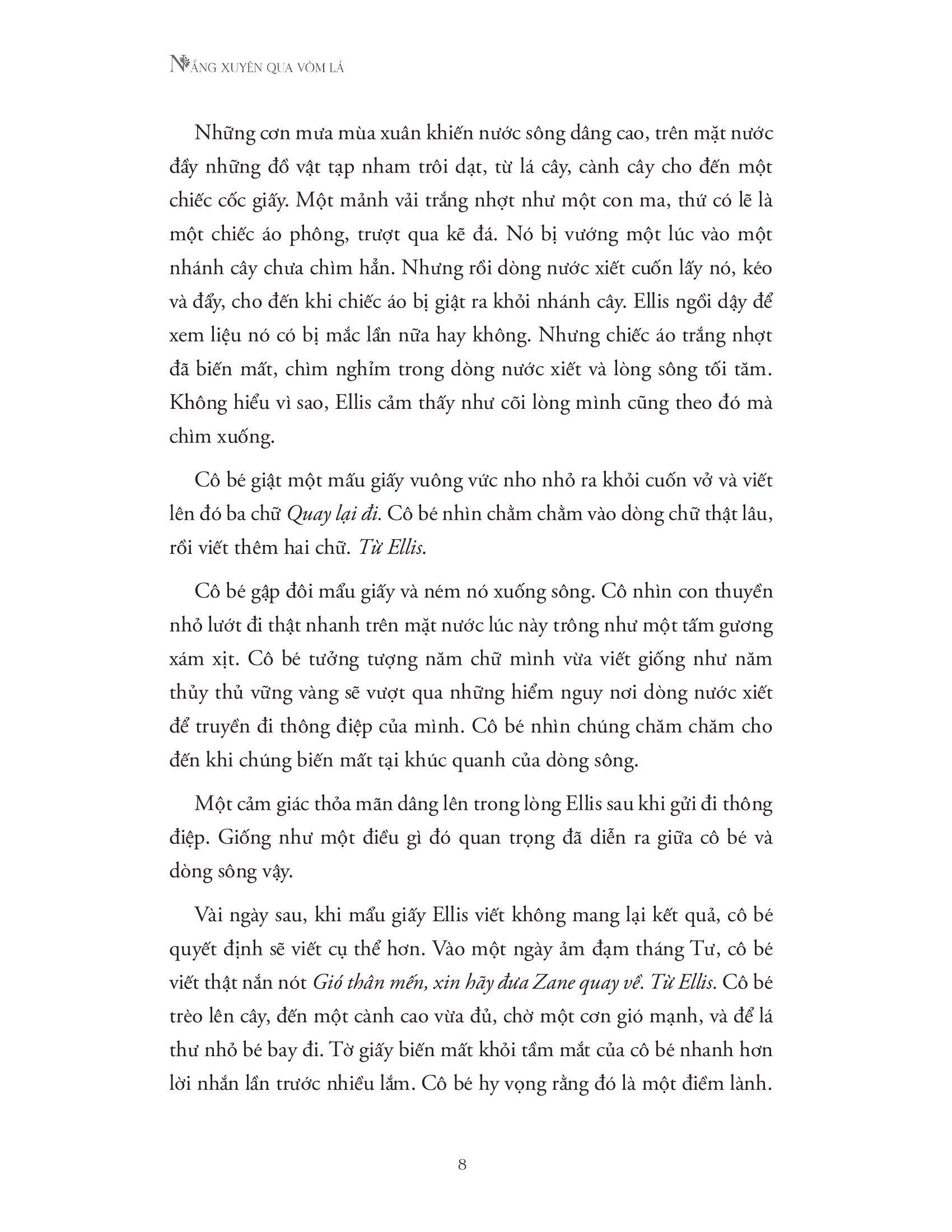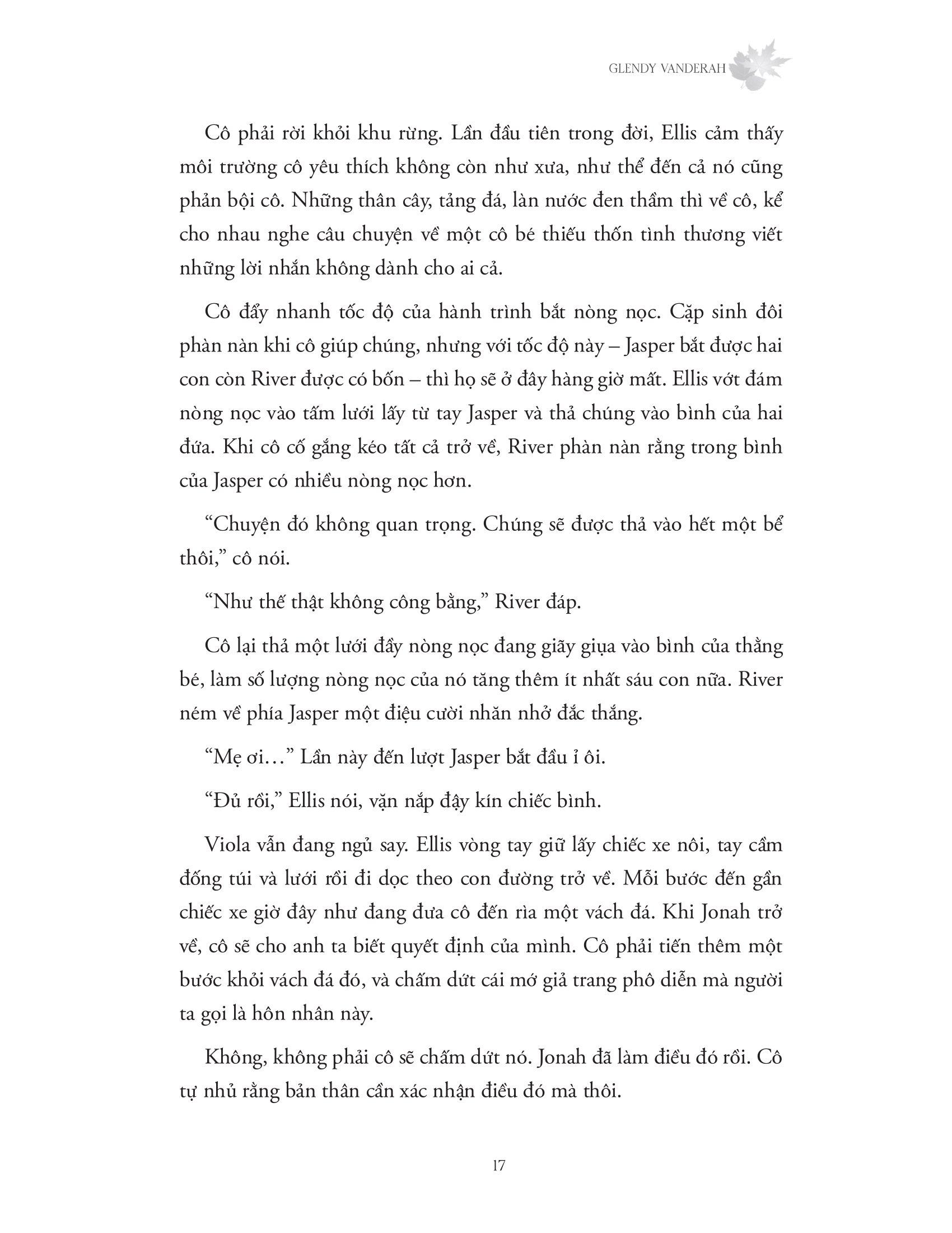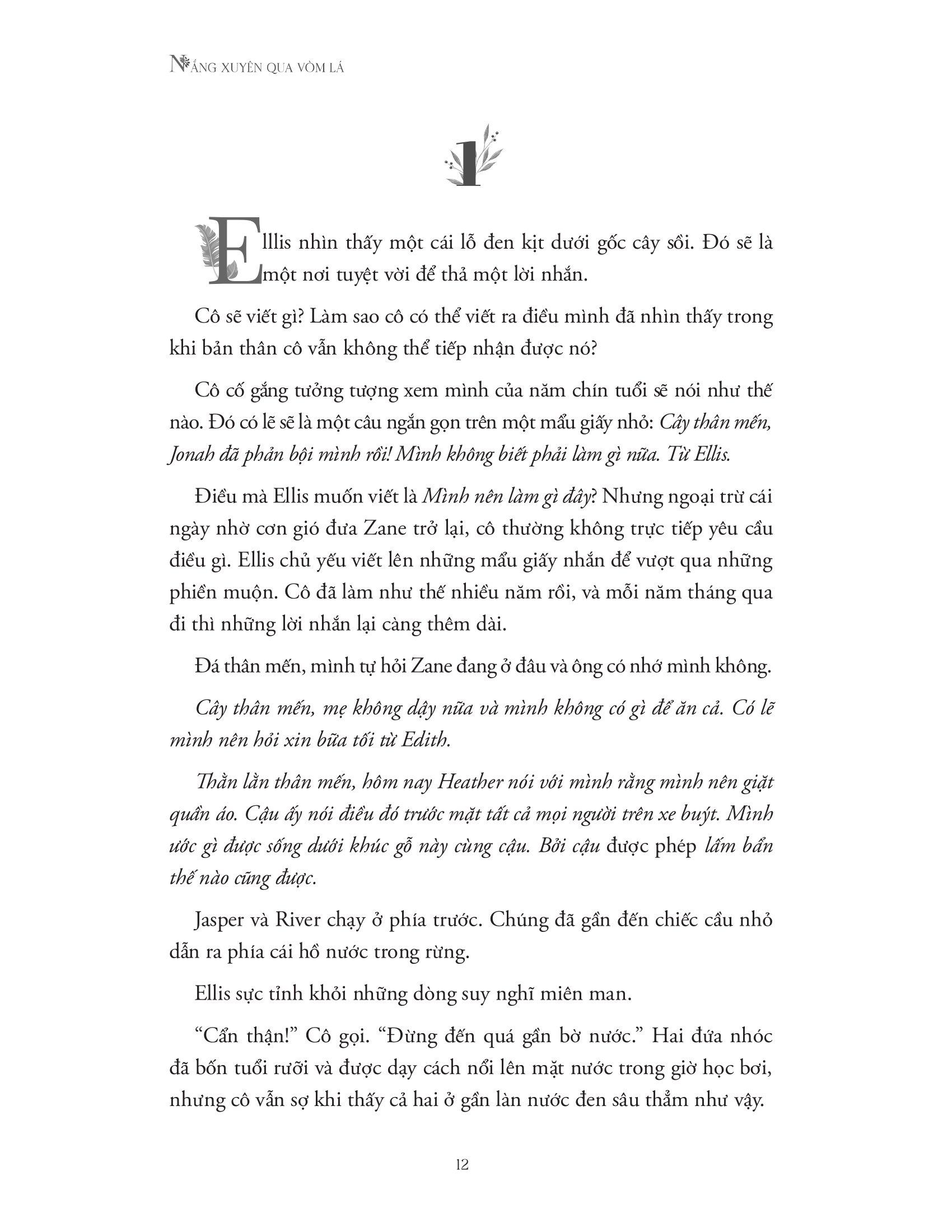 Sau Nơi khu rừng chạm tới những vì sao, Glendy Vanderah (tác giả sách bán chạy theo bình chọn của Wall Street Journal) đã tiếp nối những cảm xúc thứ tha và chữa lành ấy bằng một cuốn tiểu thuyết tuyệt diệu về tình yêu, sự mất mát và hành trình khám phá bản thân, The light through the leaves.