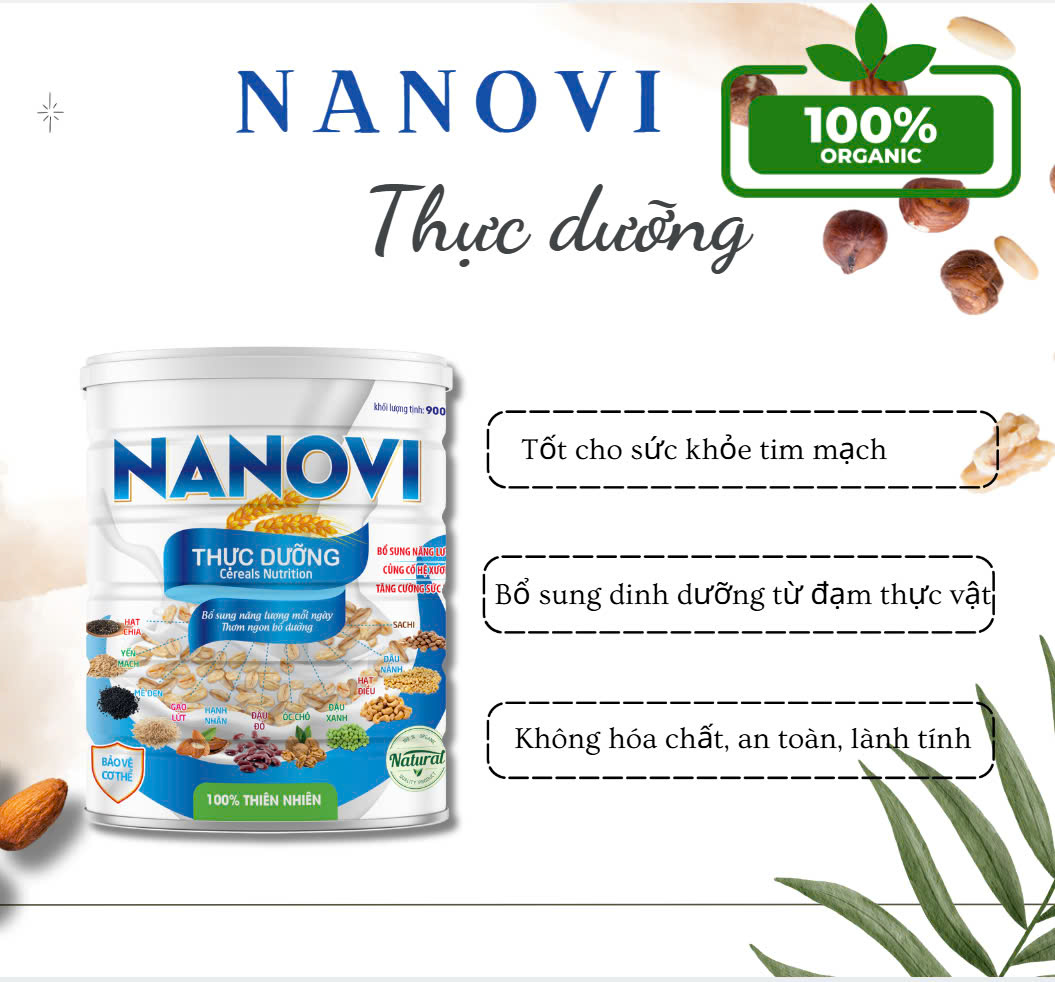 - Được sản xuất từ nguyên liệu sạch 100% Organic. ==> NANOVI THỰC DƯỠNG có thành phần gồm: yến mạch, gạo lức huyết rồng, đậu hà lan, đậu đen, đậu đỏ, mè đen và các loại hạt dinh dưỡng như: hạnh nhân, hạt óc chó nhập khẩu, hạt sen, hạt kê, hạt chia, ý dĩ, sachi,… 3.Công dụng: