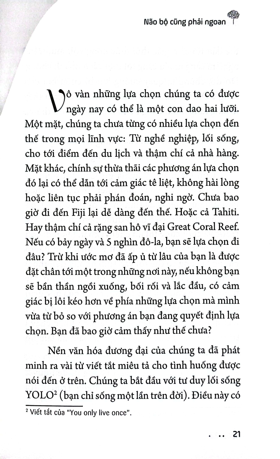 Mua tại TiktokNão Bộ Cũng Phải Ngoan THÔNG TIN TÁC GIẢ: Zoe Mckey là tác giả có sách bán chạy nhất trong lĩnh vực phát triển bản thân, đồng thời là huấn luyện viên giao tiếp lối sống. Trong những cuốn sách chân thực và truyền cảm hứng của mình, Zoe nói về những gì cô tin là trở ngại đối với việc hưởng thụ cuộc sống bạn hằng mong muốn. Cô chia sẻ những phương pháp hay nhất nhằm giúp người đọc phát triển thói quen tốt, kiểm soát sự lo lắng, giảm bớt suy nghĩ và giải phóng bản thân khỏi sự tiêu cực cũng như sự kỳ vọng của người khác. Zoe nói lưu loát năm thứ tiếng. Cô có bằng cử nhân và thạc sĩ chuyên ngành nghiên cứu quốc tế và xã hội. Khi không thực hiện sứ mệnh thay đổi thế giới, cô thích đọc sách, vẽ, chơi piano, tập thể dục và tập yoga… TÓM TẮT NỘI DUNG Trí não của chúng ta đôi khi rất giống một đứa trẻ hay la cà đây đó theo tiếng gọi của những thú vui nhất thời mà không chuyên tâm vào nhiệm vụ cần làm, đồng thời rất bốc đồng và ưa gây chuyện; có lúc lại như một người già cả, trở nên trì trệ, thiếu linh hoạt giữa chốn xô bồ, thiên biến vạn hóa. “Đứa trẻ” cần được dạy dỗ để trở nên chú tâm hơn, đạt được hạnh phúc sâu sắc, bền vững nhờ hoàn thành công việc. Bộ não cũng cần trở nên bĩnh tĩnh và trưởng thành hơn trước mọi biến cố của cuộc sống. “Người già” thì cần rèn luyện nhiều để vượt quan sự trì trệ, bớt bám víu vào những cài đặt mặc định cứng nhắc trong tâm trí để đề ra những giải pháp phù hợp với tình huống hoàn cảnh. Là một người hiểu rất rõ về khoảng cách giữa nỗ lực và thành tựu, Zoe Mckey sẽ vận dụng kiến thức sâu sắc và tài hướng dẫn khéo léo của mình để cung cấp các công cụ và chiến lược hữu hiệu nhằm giúp trí não đi vào nề nếp, kỷ luật. Qua đó, bạn có thể chịu trách nhiệm tốt hơn với hạnh phúc của chính mình và sống một cuộc đời mà bạn hằng mong ước.