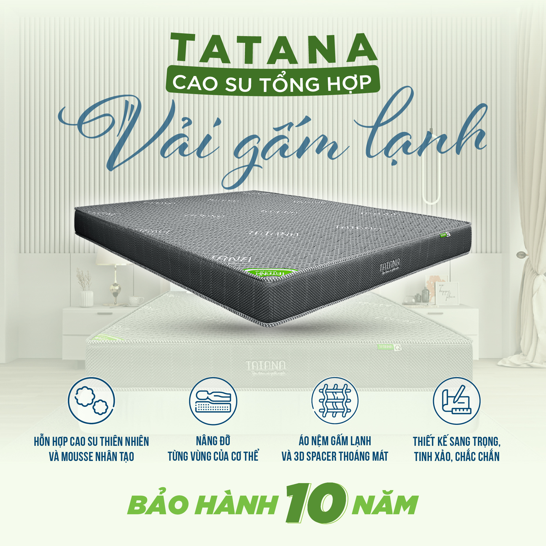Chúng tôi vận chuyển miễn phí NỘI THÀNH các khu vực: Tp.HCM ( trừ Cần Giờ), Nội thành các quận Tp.Hà Nội. Đồng Nai (Tp. Biên Hòa, Long Thành ), Bình Dương ( Dĩ An, Thuận An, Thủ Dầu Một), Tp. Cần Thơ, An Giang(Tp. Long Xuyên), Tp. Vũng Tàu , Đắk Lắk (Tp.Buôn Ma Thuột), Bình Phước (Tp Đồng Xoài) Khánh Hòa (Tp. Nha Trang) , Kiên Giang (Tp. Rạch Giá) , Bình Thuận (Tp. Phan Thiết). - Hỗ trợ 50% phí vận chuyển ở các khu vực tỉnh khác. - Anh/Chị vui lòng liên hệ shop để được hỗ trợ chi tiết. Nệm cao su tổng hợp vải gấm lạnh Tatana được sản xuất từ nguyên liệu tổng hợp, bao gồm cao su thiên nhiên và mousse cao su nhân tạo. Với dây chuyền công nghệ và quy trình sản xuất hiện đại tạo thành khối nệm, đảm bảo tối ưu các tính năng của nệm cao su như: Nâng đỡ từng vùng cơ thể, tạo độ đàn hồi và êm ái, đem đến giấc ngủ ngon mỗi đêm.       Thiết kế bề mặt nệm dẻo dai với cả 2 mặt vô cùng tiện lợi. Lớp mousse chần bên trong mặt vải dày 16 li đem đến độ phồng và êm hoàn hảo.       Bên hông nệm được may vải 3D spacer với sắc xám mang lại cảm giác ấm áp vào mùa đông. Bên cạnh đó, thiết kế vải với hàng ngàn lỗ nhỏ lại giúp người nằm cảm thấy được sự thoáng mát vào mùa hạ, khả năng lưu thông không khí trong và ngoài nệm để cơ thể được nghỉ ngơi trong trạng thái thoải mái nhất.        Nệm cao su tổng hợp được may liền viền tạo thành khối nệm vuông vức với các cạnh sắc sảo, độ phẳng nệm tuyệt đối cùng độ êm mềm, đảm bảo sẽ là lựa chọn tuyệt vời cho giấc ngủ của gia đình.        Áo nệm: Sử dụng vải gấm lạnh tinh xảo với hoa văn đẹp mắt, tuy đơn giản nhưng lại sang trọng và mới mẻ cho phòng ngủ của bạn. Phía trên vải có in logo Tatana, đây cũng là chi tiết giúp khách hàng phân biệt được hàng thật và giả bằng mắt thường để có sự chọn lựa sản phẩm tốt nhất.   Đặc tính vượt trội mà nệm cao su tổng hợp Tatana mang lại: