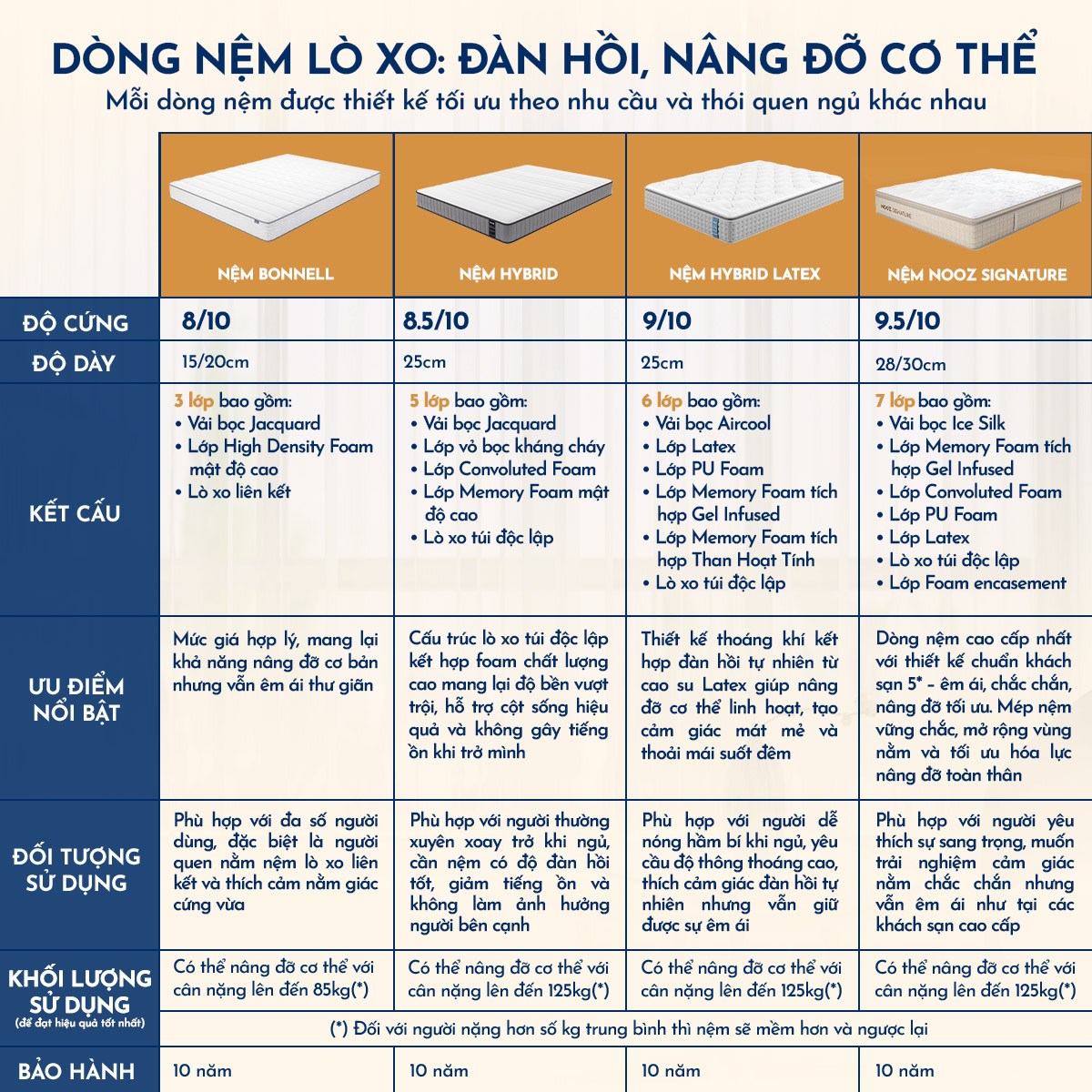 - Sản phẩm nệm NOOZ Signature bao gồm: Vải bọc Ice Silk, Memory Foam tích hợp Gel Infused, Convoluted Foam, PU Foam, Cao su thiên nhiên Latex, Hàng trăm lò xo túi độc lập cao cấp nâng đỡ 7 vùng, Foam encasement, Đáy chống trượt