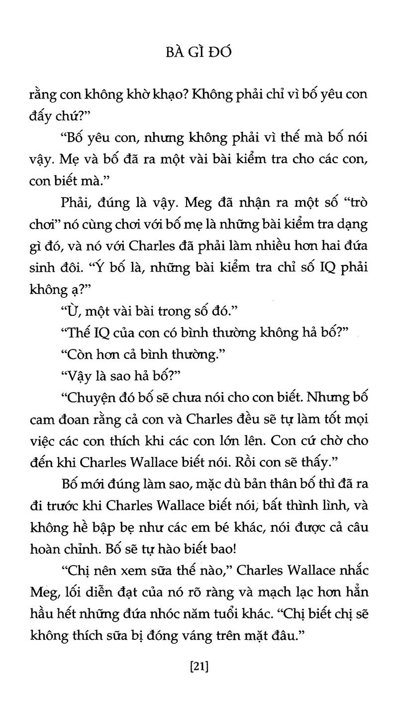 Đó là một đêm giông bão mịt mùng. Meg Murry cùng em trai nhỏ Charles Wallace và mẹ đang ở trong bếp thì một vị khách rầy rà nhất trần đời xuất hiện.