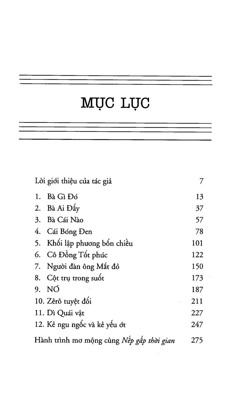 "Những đêm bão là ta khoái lắm đấy," người lạ kỳ cục bảo ba mẹ con. "Chỉ có điều ta bị luồng gió cuốn phăng đi, rồi bị thổi trệch cả đườ Ta sẽ ngồi xuống một lát, đi ủng vào và sau đó lên đường. Nói đến chuyện đường xá, nhân đây, có tồn tại cái vật gọi là khối lập phương bốn chiều, cưng ạ."