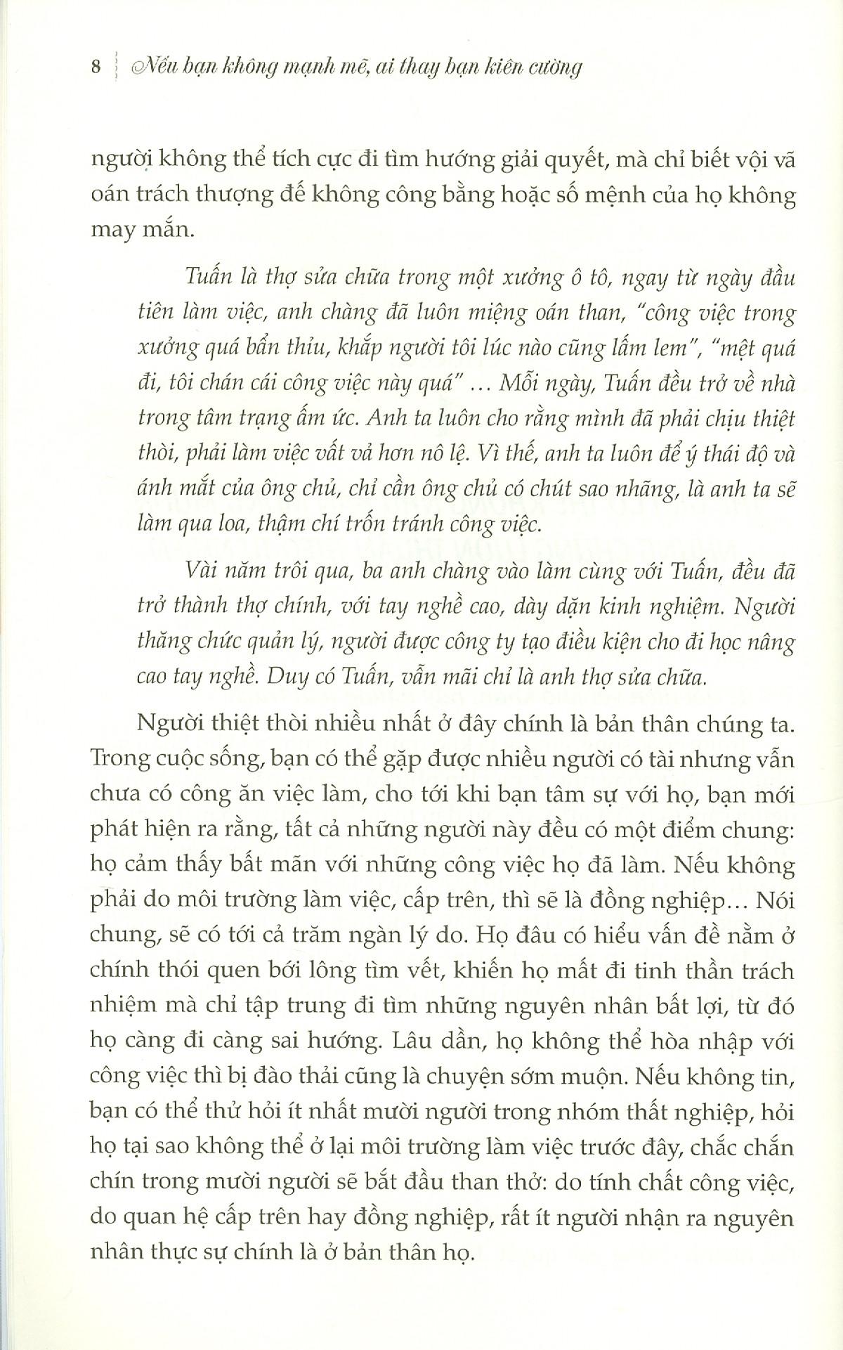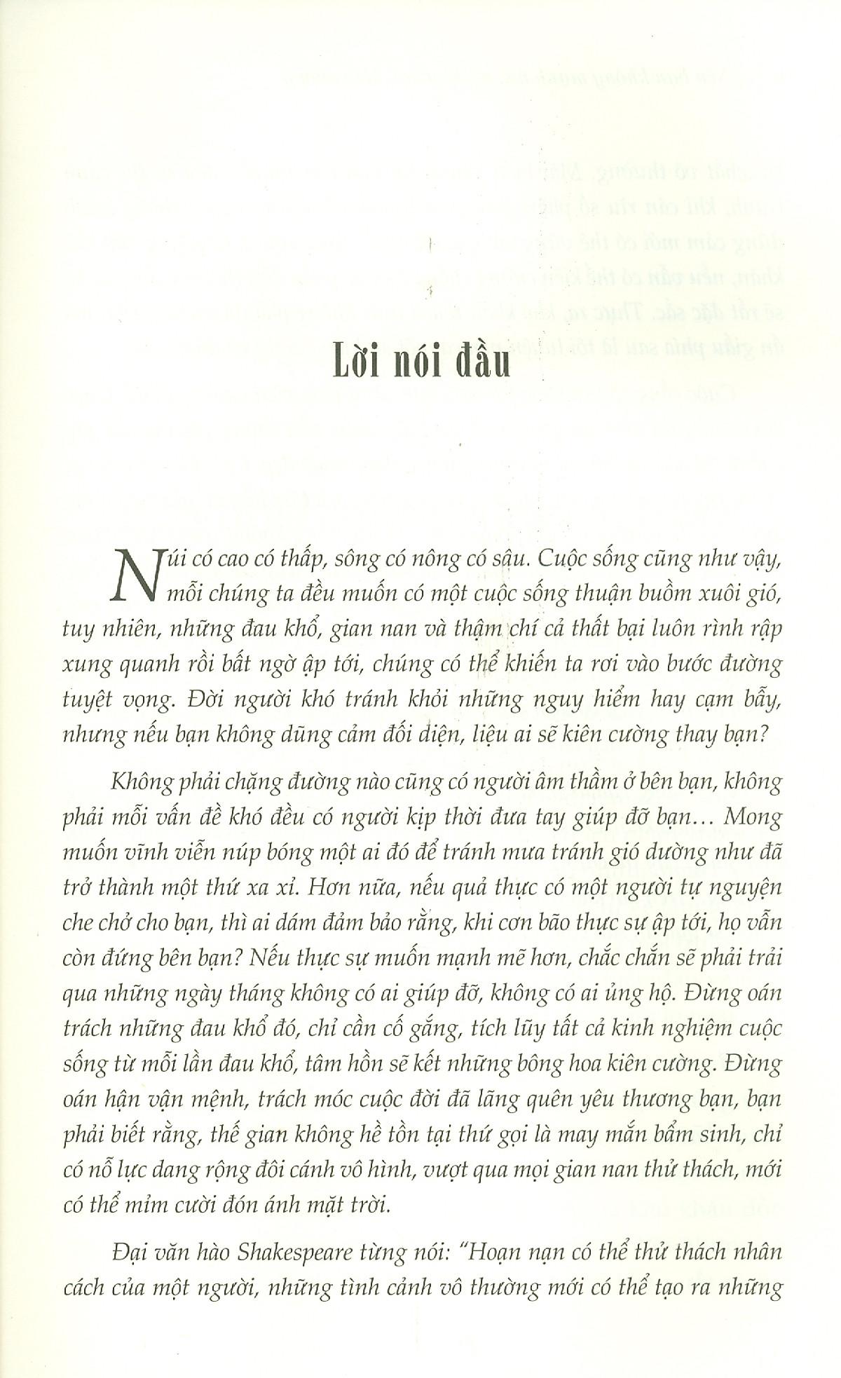 Nếu Bạn Không Mạnh Mẽ, Ai Thay Bạn Kiên Cường Không phải chặng đường nào cũng có người âm thầm ở bên bạn, không phải mỗi vấn đề khó đều có người kịp thời đưa tay giúp đỡ bạ Mong muốn vĩnh viễn núp bóng một ai đó để tránh mưa tránh gió dường như đã trở thành một thứ xa xỉ. Hơn nữa, nếu quả thực có một người tự nguyện che chở cho bạn, thì ai dám đảm bảo rằng, khi cơn bão thực sự ập tới, họ vẫn còn đứng bên bạn? Nếu thực sự muốn mạnh mẽ hơn, chắc chắn sẽ phải trải qua những ngày tháng không có ai giúp đỡ, không có ai ủng hộ. Đừng oán trách những đau khổ đó, chỉ cần cố gắng, tích lũy tất cả kinh nghiệm cuộc sống từ mỗi lần đau khổ, tâm hồn sẽ kết những bông hoa kiên cường.