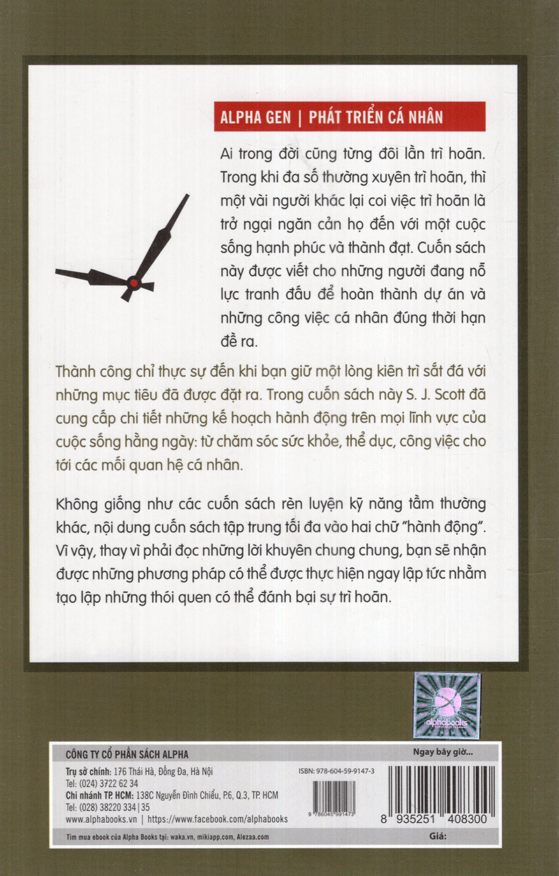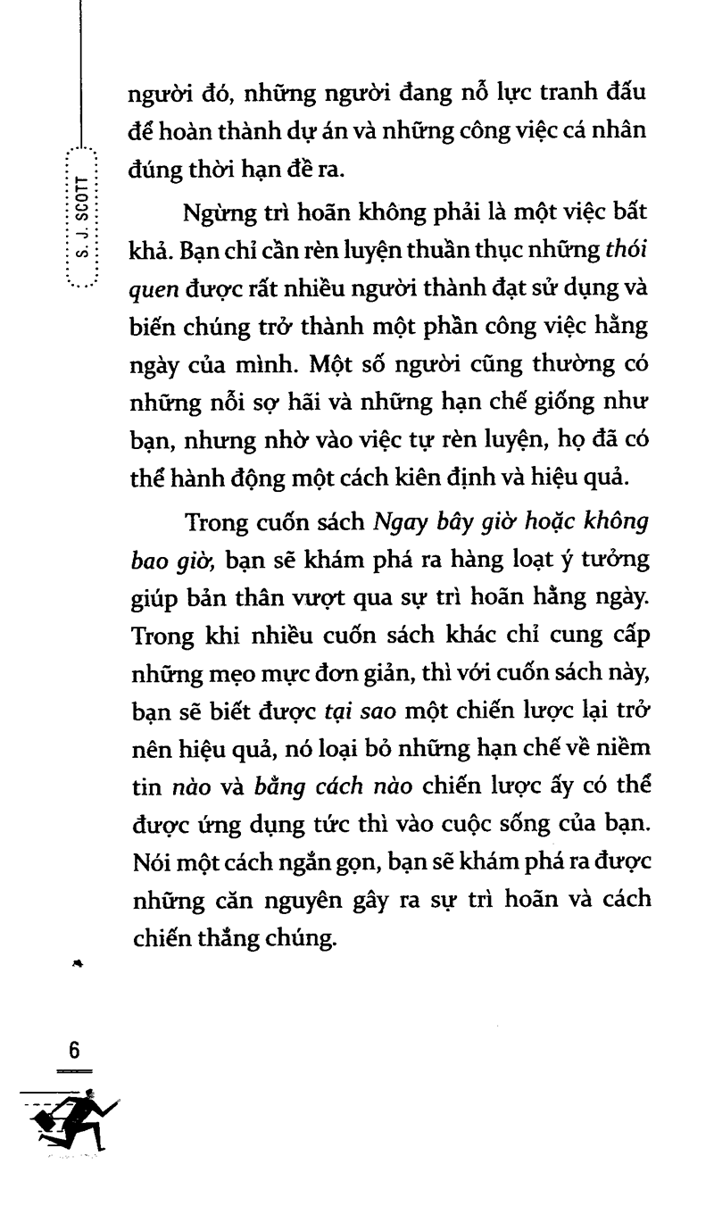 Ngay Bây Giờ Hoặc Không Bao Giờ (Tái Bản) Ngay bây giờ hoặc không bao giờ sẽ giúp bạn khám phá ra hàng loạt ý tưởng giúp bản thân vượt qua sự trì hoãn hằng ngày. Trong khi nhiều cuốn sách khác chỉ cung cấp những mẹo mực đơn giản, thì với cuốn sách này, bạn sẽ biết được tại sao một chiến lược lại trở nên hiệu quả, nó loại bỏ những hạn chế và niềm tin nào và bằng cách nào chiến lược ấy có thể được ứng dụng tức thì vào cuộc sống của bạn… Thành công chỉ thực sự đến khi bạn giữ một lòng kiên trì sắt đá với những mục tiêu đã được đặt ra. Trong cuốn sách này, J. S. Scott đã cung cấp chi tiết những kế hoạch hành động trên mọi lĩnh vực của cuộc sống hằng ngày: từ chăm sóc sức khỏe, thể dục, công việc cho tới các mối quan hệ cá nhân. Không giống như các cuốn sách rèn luyện kỹ năng tầm thường khác, nội dung cuốn sách tập trung tối đa vào hai chữ “hành động”. Vì vậy, thay vì phải đọc những lời khuyên chung chung, bạn sẽ nhận được những phương pháp có thể được thực hiện ngay lập tức nhằm tạo lập những thói quen có thể đánh bại sự trì hoãn .