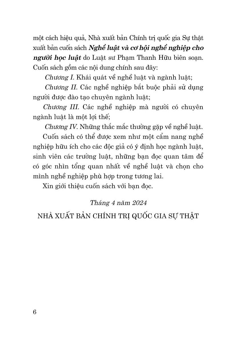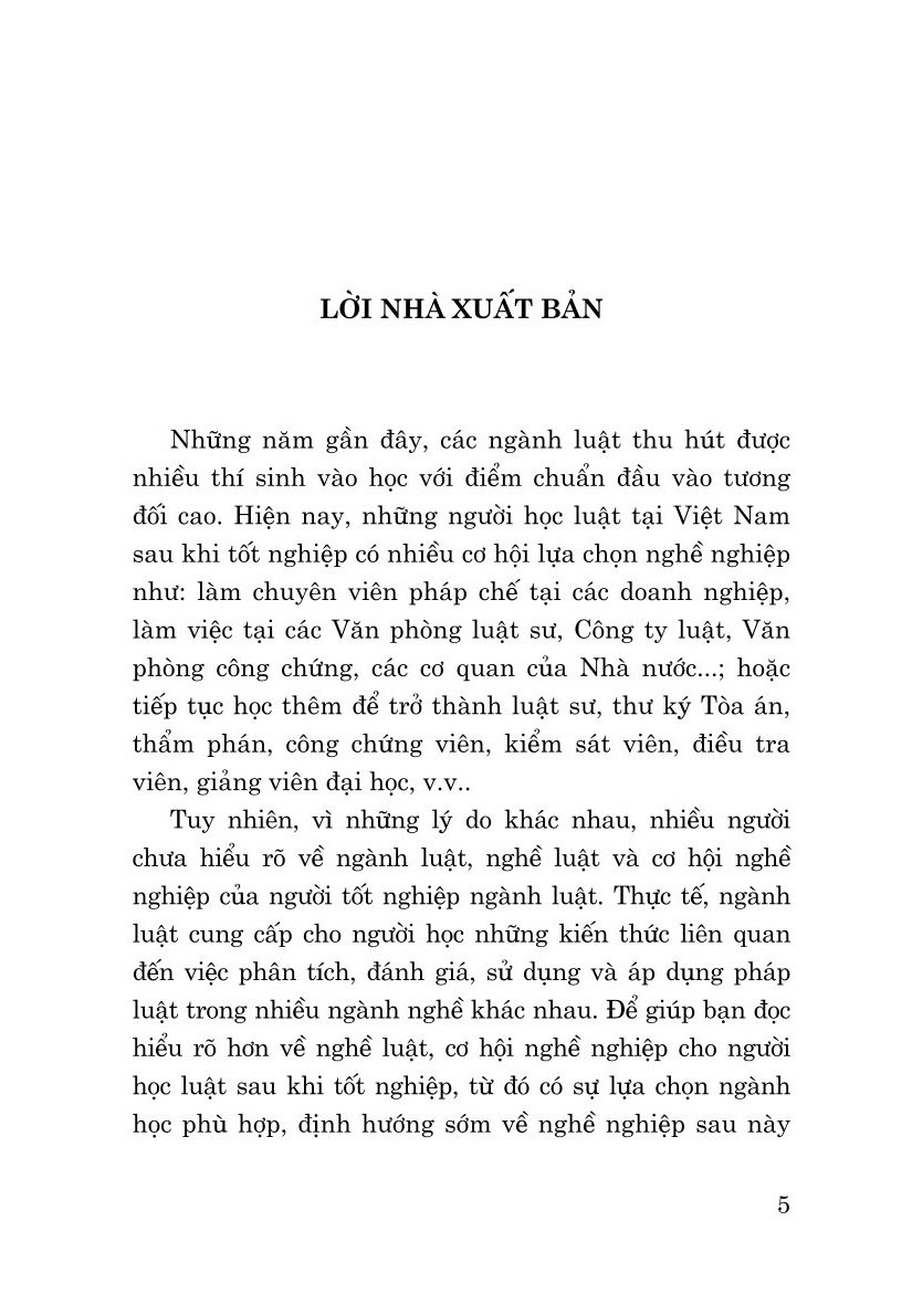 Mua tại TiktokCuốn sách Nghề luật và cơ hội nghề nghiệp cho người học luật do Luật sưu Phạm Thanh Hữu biên soạn, gồm các nội chính sau đậy: Chường I. Khái quát về nghề luật sư và ngành luật Chương II. Các nghề nghiệp bắt buộc phải sử dụng người được đào tạo chuyên ngành luật Chương II. Các nghề nghiệp mà người có chuyên ngành luật là một lợi thế Chương IV. Những thắc mắc thường gặp về nghề luật.