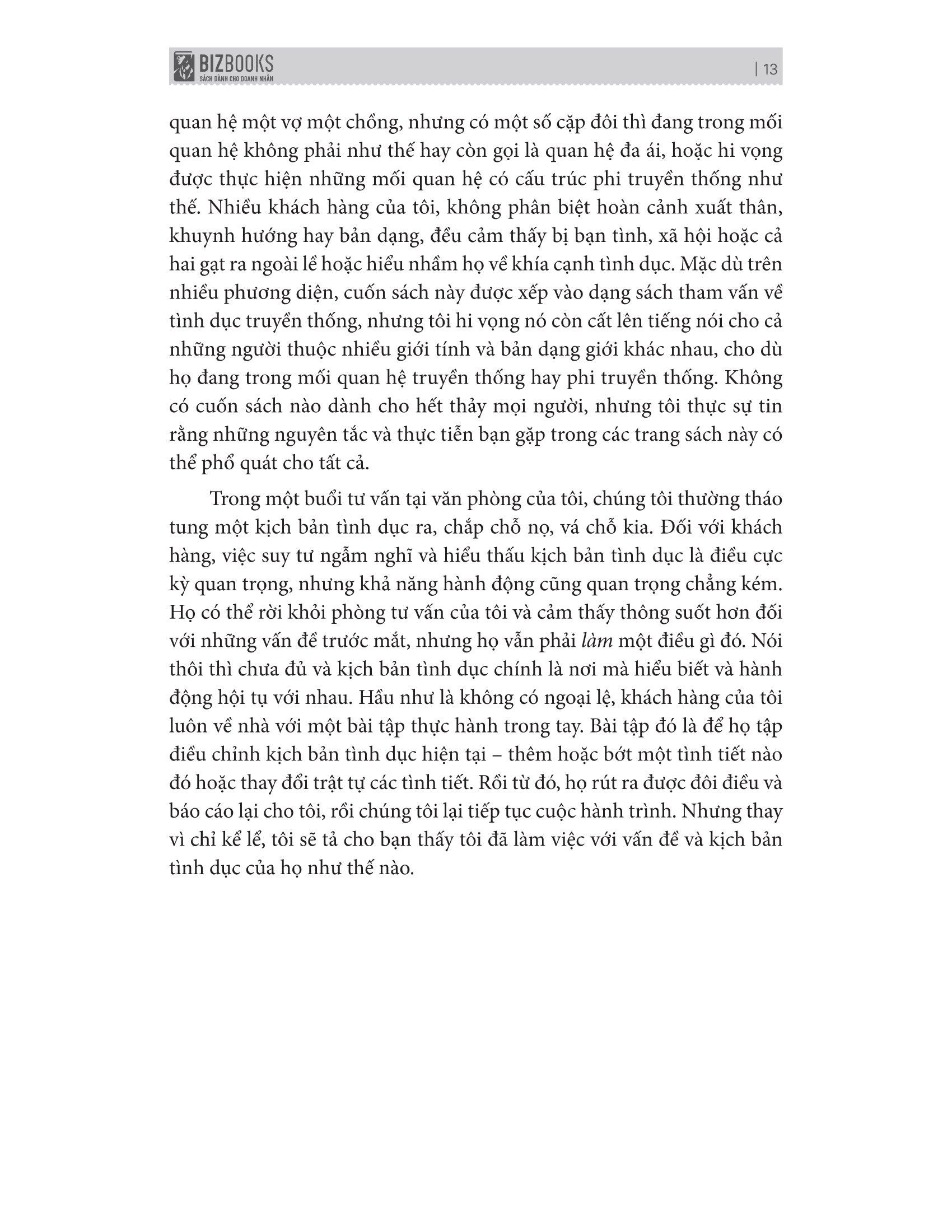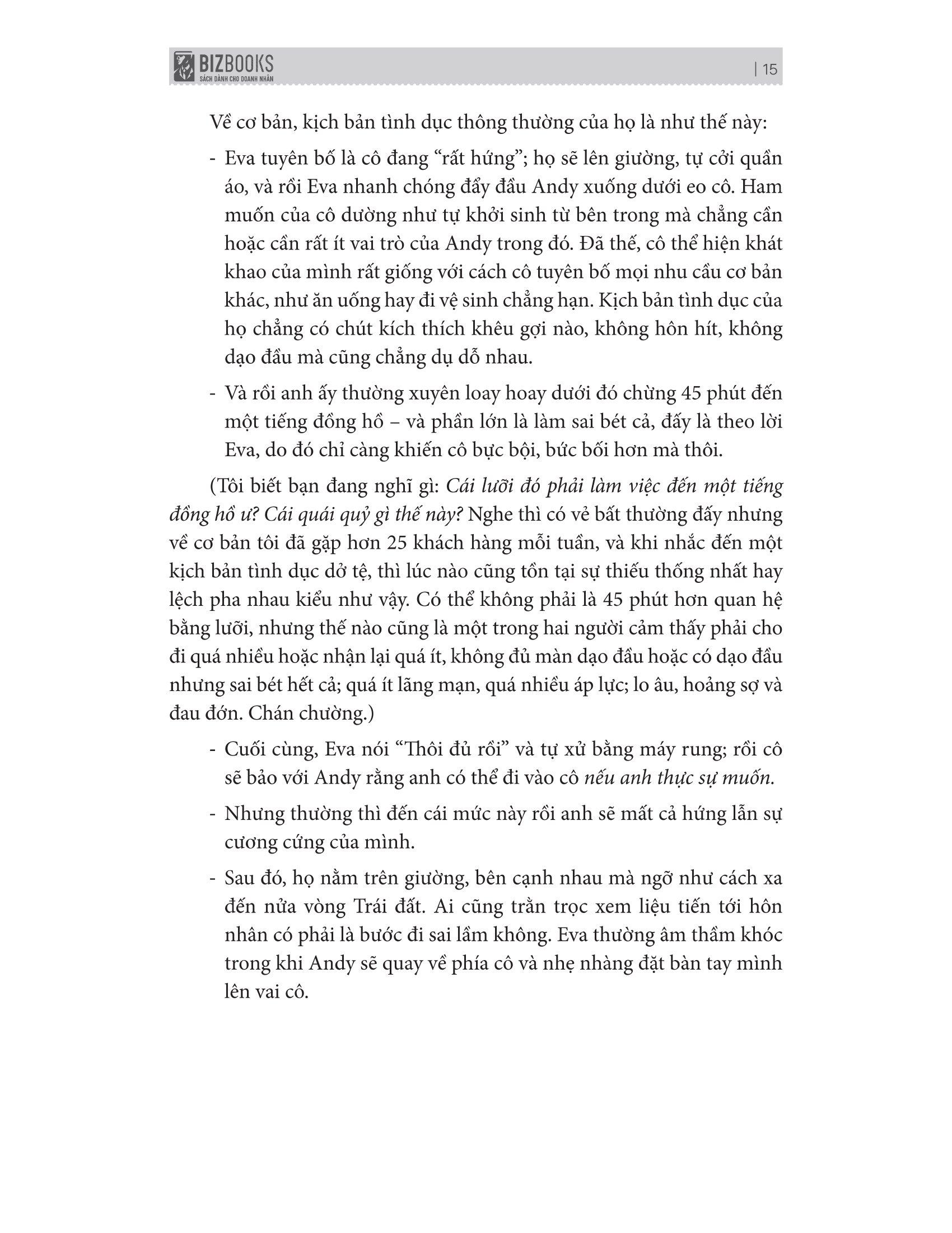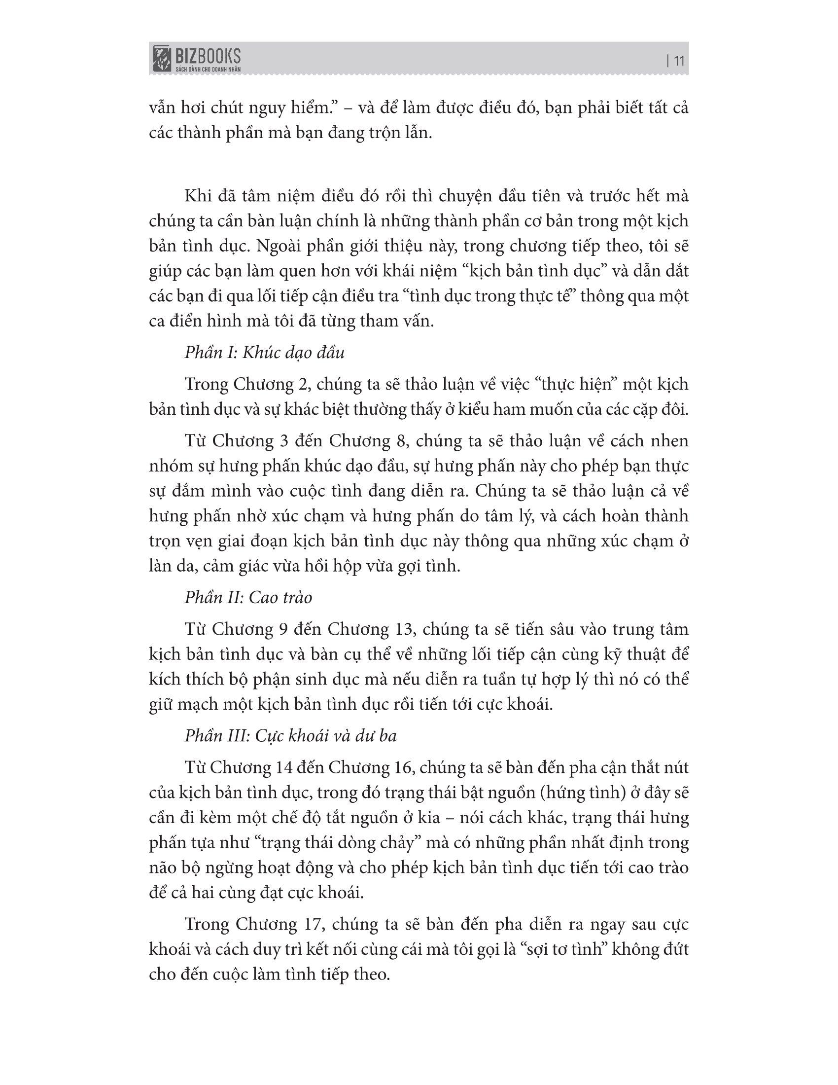 Trong xuyên suốt cuốn sách này, bạn có thể khám phá tận hang cùng ngõ hẻm của vùng đất “mây mưa”, những đề tài gợi tình và những “bí kíp” tạo hưng phẩn chỉ bằng những điểm chạm. Bài tập thực hành tại nhà dưới dạng bài tự suy ngẫm, kích thích tâm sinh lý và rèn luyện hành vi sẽ giúp bạn nâng cao được phần năng khiếu; Thế nhưng còn phần đam mê, thực hành – Đó lại là tuỳ vào bạn!