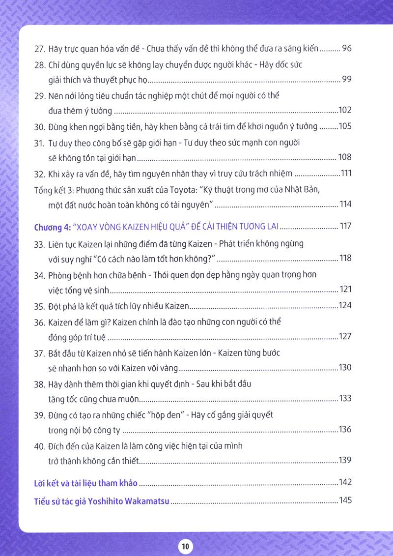 Kaizen là hành vi thay đổi hiện trạng để vượt qua giới hạn. Càng tích lũy những Kaizen nhỏ trong sinh hoạt thường ngày thì càng có sức mạnh lớn. Thành công của Toyota đã minh chứng cho điều này. Sự tiến bộ của con người là không giới hạn. Dù là học sinh sinh viên, dù là nhân viên văn phòng hay là người làm việc tại công xưởng, tôi hy vọng các bạn hãy luôn suy nghĩ “hàng ngày Kaizen, hàng ngày thực hiện” để trở nên mạnh mẽ hơn trong thời đại này.
