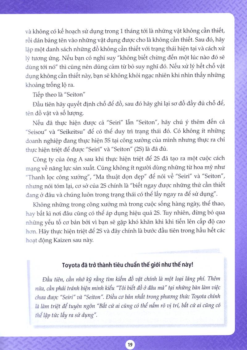 Kaizen của Toyota vốn là hệ thống được sinh ra tại nơi sản xuất nhưng đồng thời Kaizen cũng được xem là hệ thống đào tạo những con người biết suy nghĩ thông qua tạo ra những cơ hội để họ đưa ra trí tuệ. Cuốn sách này sử dụng nhiều ví dụ trong công xưởng sản xuất Toyota, nhưng nếu suy nghĩ ở khía cạnh “phương pháp tư duy” thì cuốn sách này có nhiều kinh nghiệm mà bất kỳ ai, bất kể lĩnh vực nào, thậm chí học sinh tiểu học cũng có thể áp dụng để tạo ra thành quả.