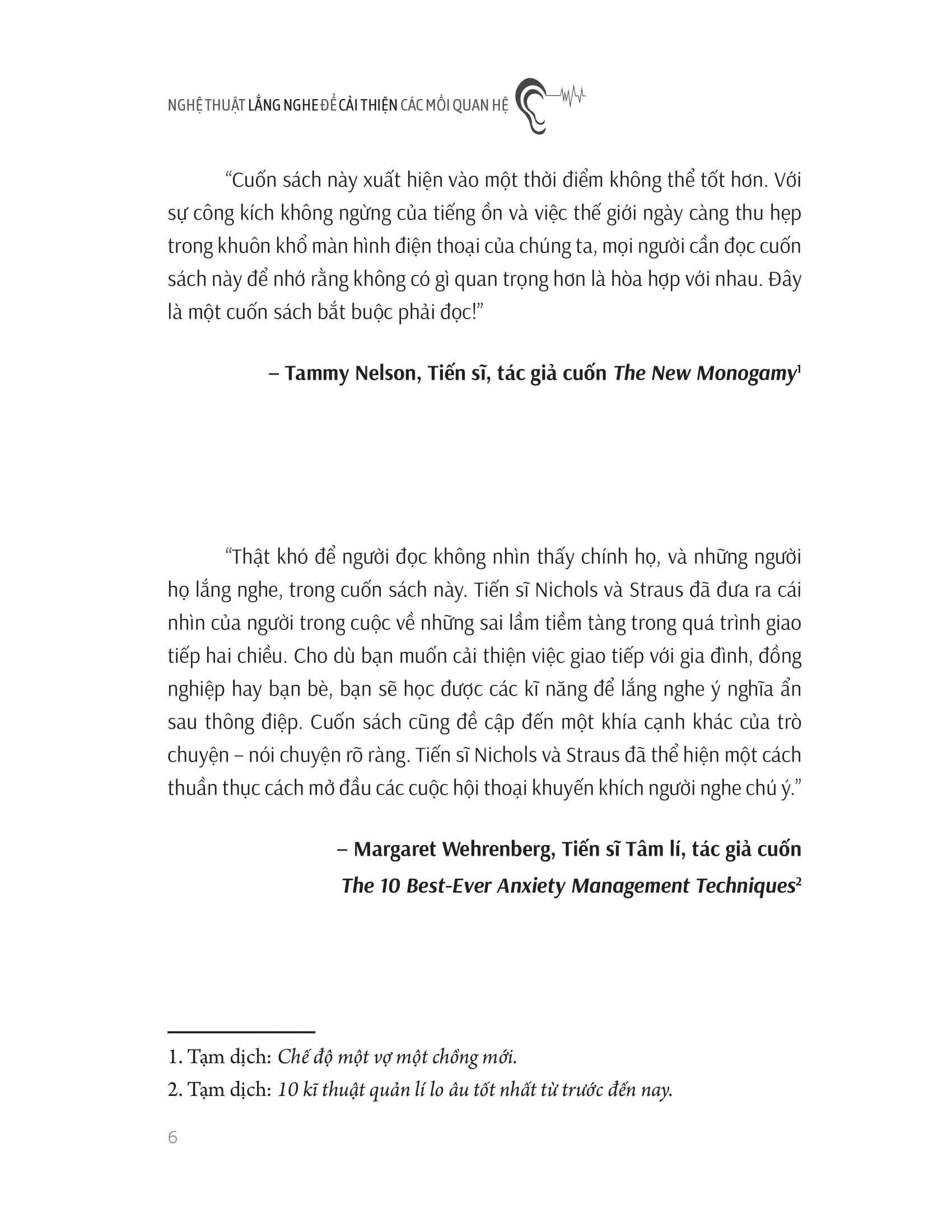 - Phần Bốn:Khám phá cách việc bị lắng nghe được phá vỡ trong các mối quan hệ thân mật, trong mối quan hệ gia đình, giữa bạn bè và nơi làm việc; giải thích cách động lực của các mối quan hệ này làm phức tạp hóa việc lắng nghe, và cách sử dụng hiểu biết này để vượt qua rào cản. Bên cạnh đó, tác giả sẽ mô tả cách để lắng nghe giữa khác biệt về văn hóa xã hội, chính trị, ngay cả khi những cuộc trò chuyện mang tính cá nhân sâu sắc, và người kia dường như khó hiểu một cách vô lí. Trong cuốn sách chứa đầy những ví dụ sống động này, các tác giả sẽ giúp chúng ta khôi phục cảm giác cân bằng trong cách suy nghĩ về các mối quan hệ, trở thành người lắng nghe tốt hơn, biến đổi các mối quan hệ quan trọng nhất trong cuộc sống và tiến thêm một bước để hể hiện nhiều hơn sự quan tâm mà ta dành cho nhau.