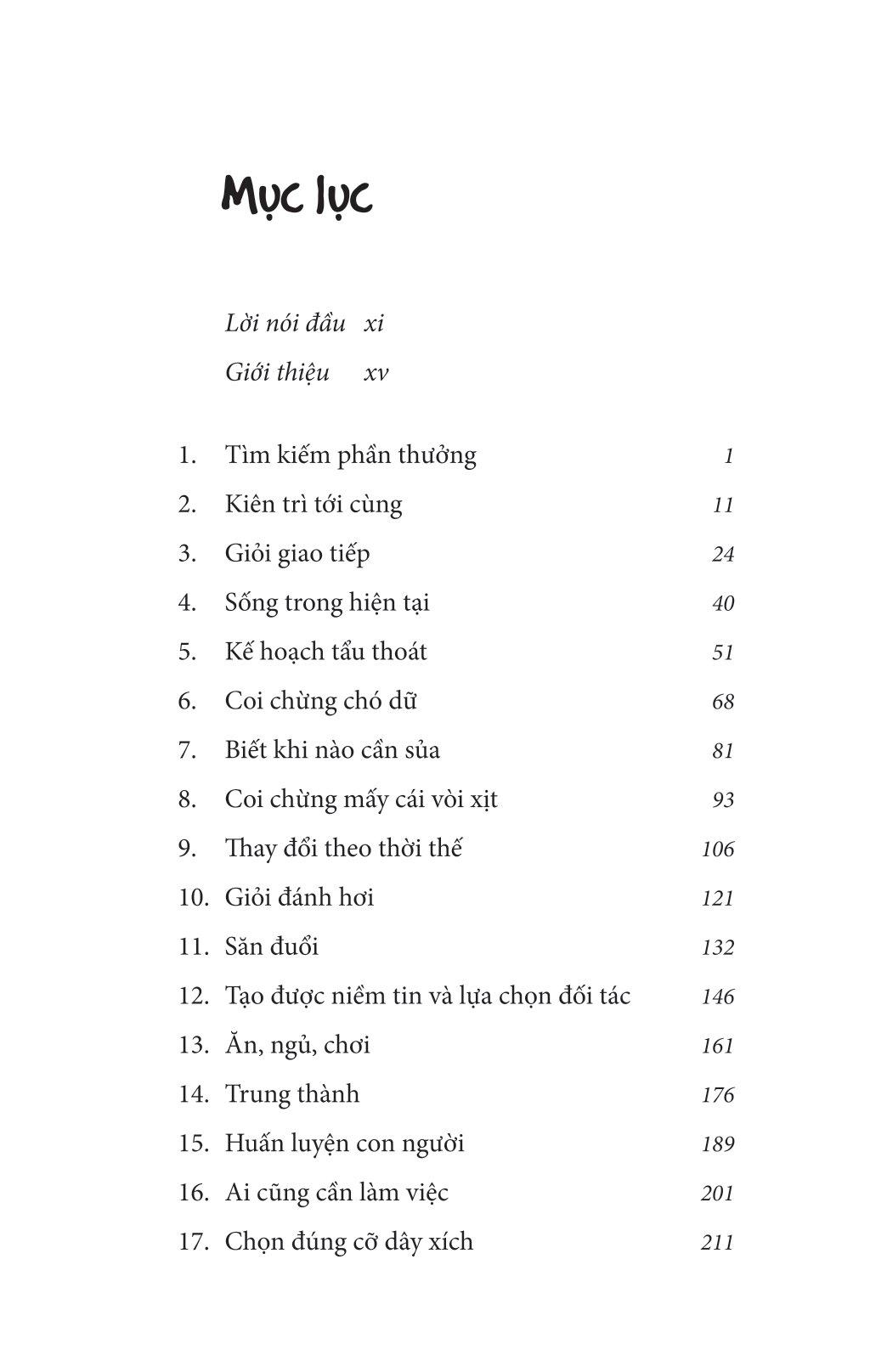 Hành văn dí dỏm, minh họa cực kỳ hài hước để các chủ đề luôn thường có trong dòng sách nghệ thuật sống mang tính vừa hướng dẫn vừa giải trí khiến cho sách rất dễ đọc: loài người vẫn còn phải học nữa học mãi cái tính kiên trì [đòi cho bằng được], khôn ngoan [biết lúc nào nên sủa và sủa chuyện gì], chấp nhận và làm quen với sự thay đổi, lắng nghe trực giác [nhạy như mũi chó] Chó là vật nuôi có nhiều thành tích với con người, nên sống vui vẻ nhạy bén như chó mà thành đạt trong công việc thì thật là đáng sống!