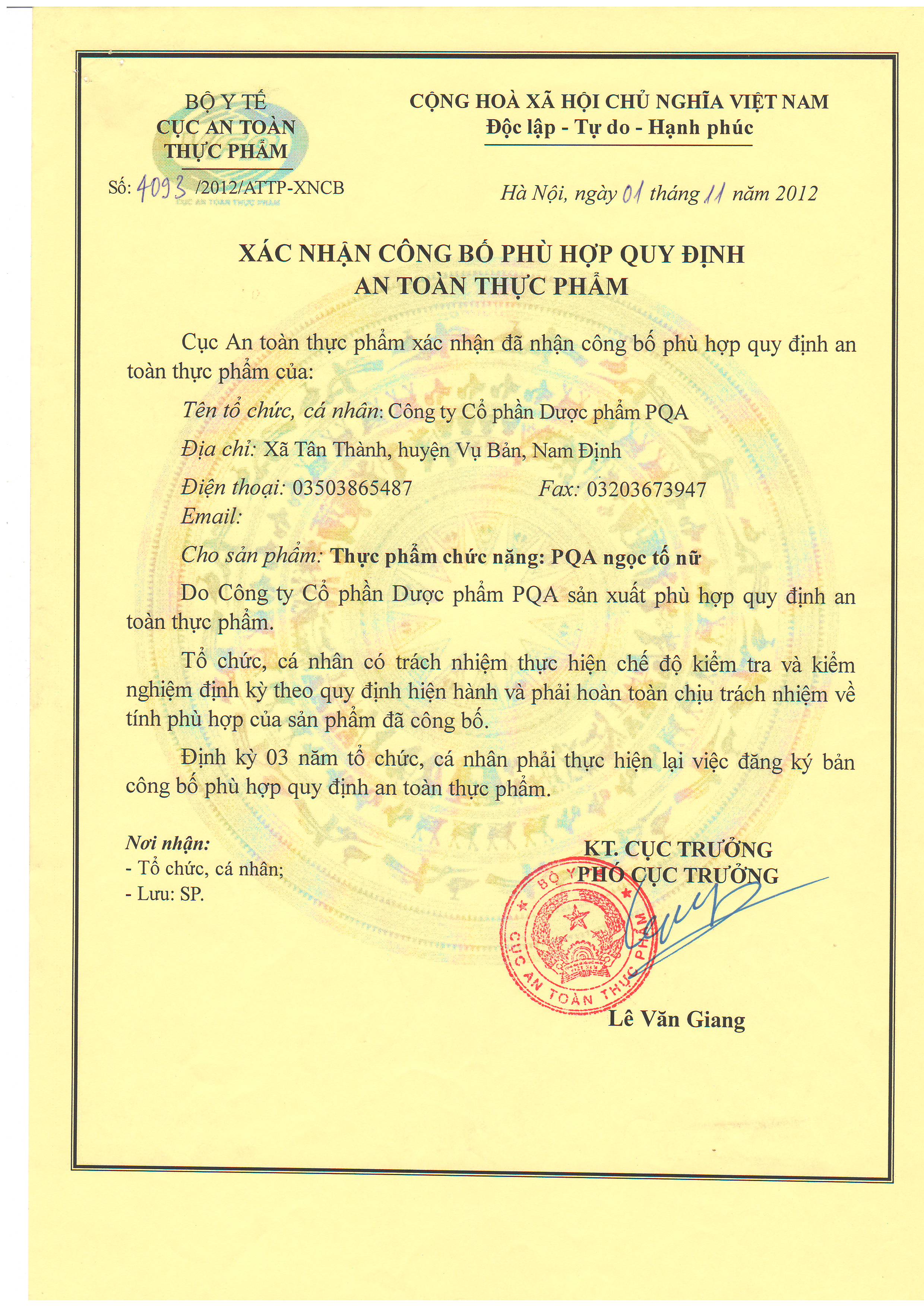 - Địa chỉ sản xuất: Công ty Cổ phần Dược phẩm PQA. Thửa 99, Khu Đồng Quàn, Xã Tân Thành, Huyện Vụ Bản, Tỉnh Nam Định. THÀNH PHẦN: