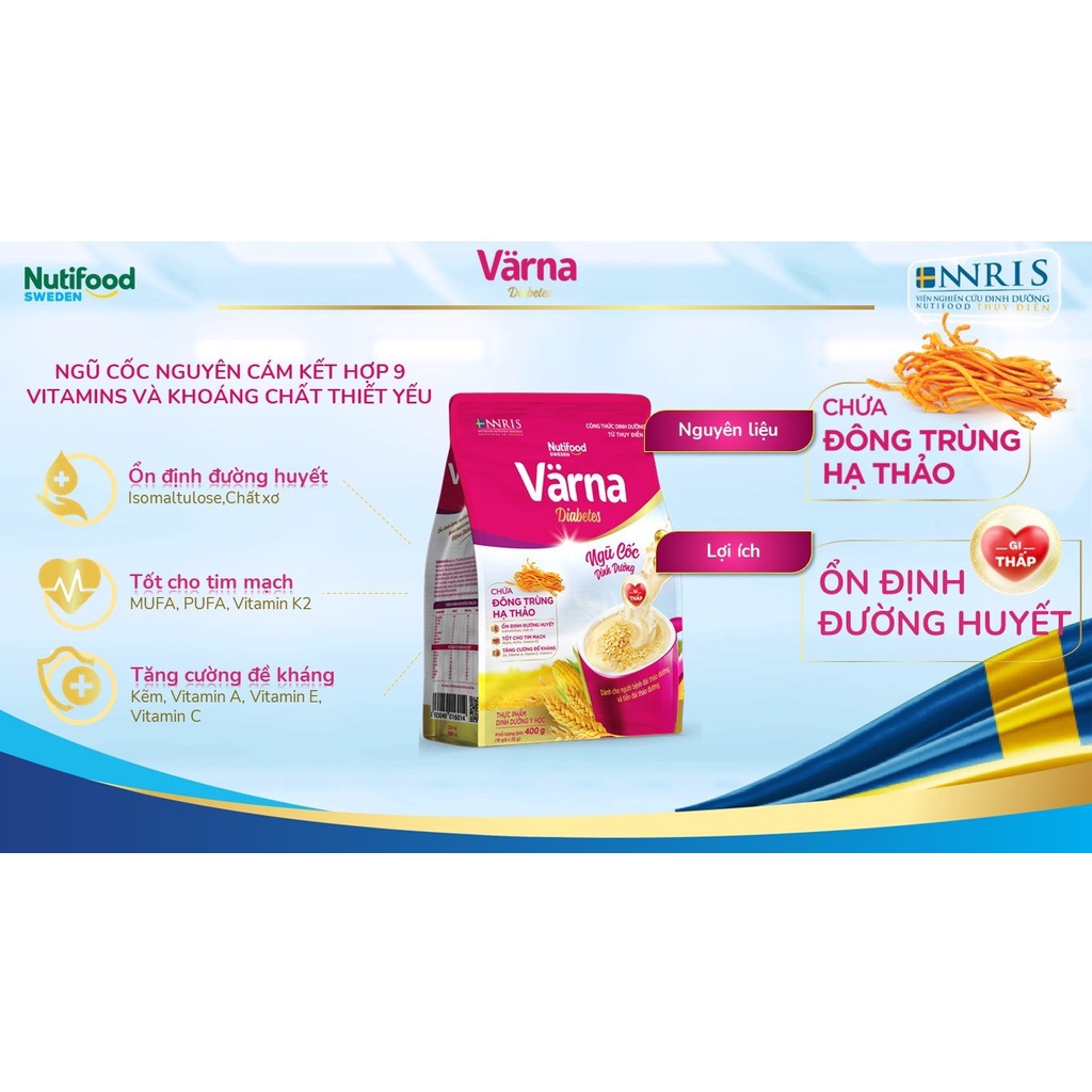 NGŨ CỐC DINH DƯỠNG VÄRNA DIABETES MỚI có chỉ số GI thấp với công thức đặc chế được kiểm chứng bởi VIỆN NGHIÊN CỨU DINH DƯỠNG NUTIFOOD THỤY ĐIỂN - NNRIS chứa ĐÔNG TRÙNG HẠ THẢO VÀ 9 VITAMIN KHOÁNG CHẤT thiết yếu giúp TĂNG CƯỜNG SỨC ĐỀ KHÁNG kết hợp cùng ISOMALTULOSE và CHẤT XƠ giúp ỔN ĐỊNH ĐƯỜNG HUYẾT HIỆU QUẢ.