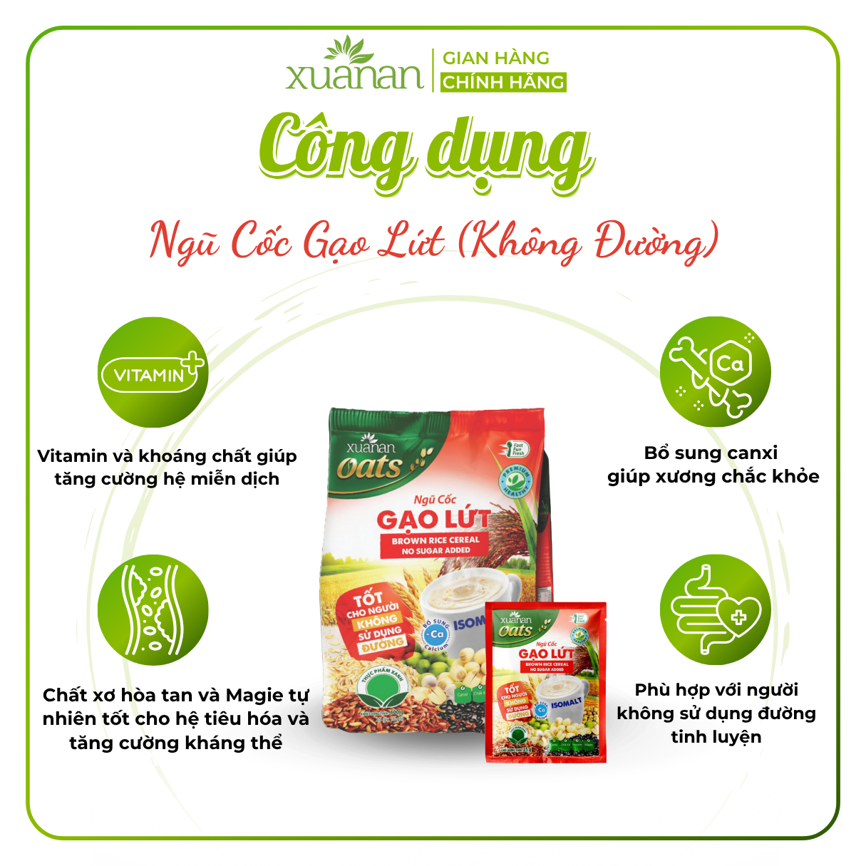 Thành Phần: Gạo lứt huyết rồng , Yến Mạch , Ngô , Đậu Xanh , lúa mạch , múa mỳ , canxi Công dụng : Trong ngũ Cốc có đường ISOMALT : Đây là loại