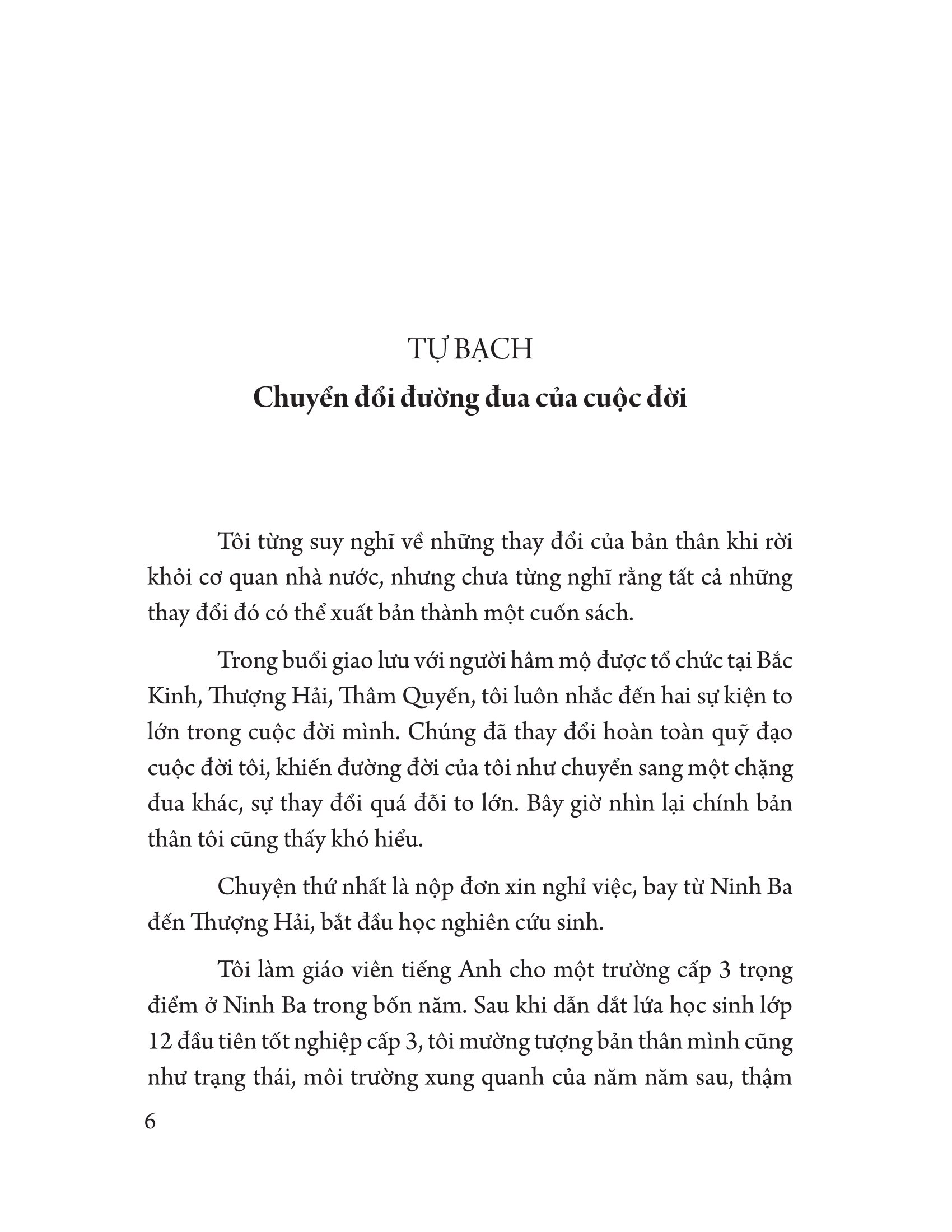 Hành trình của tác giả Trần Lập Phi là hành trình "chuyển đổi đường đua của cuộc đời". Khi đọc cuốn sách này, bạn sẽ phải tự đặt ra câu hỏi rằng liệu tương lai "ổn định", êm ả không chút bất ngờ có phải tương mà bản thân mong muốn hay không. Bạn sẽ phải làm việc với bản thân, giữa một bên truyền thống là theo đuổi sự yên ổn, thế giới ngoài kia hiểm ác và đầy những điều bất trắc; còn nửa còn lại thì thúc giục bạn trải nghiệm và khám phá nhiều hơn, đừng quá "ổn định" mà kìm hãm chính bản thân mình.