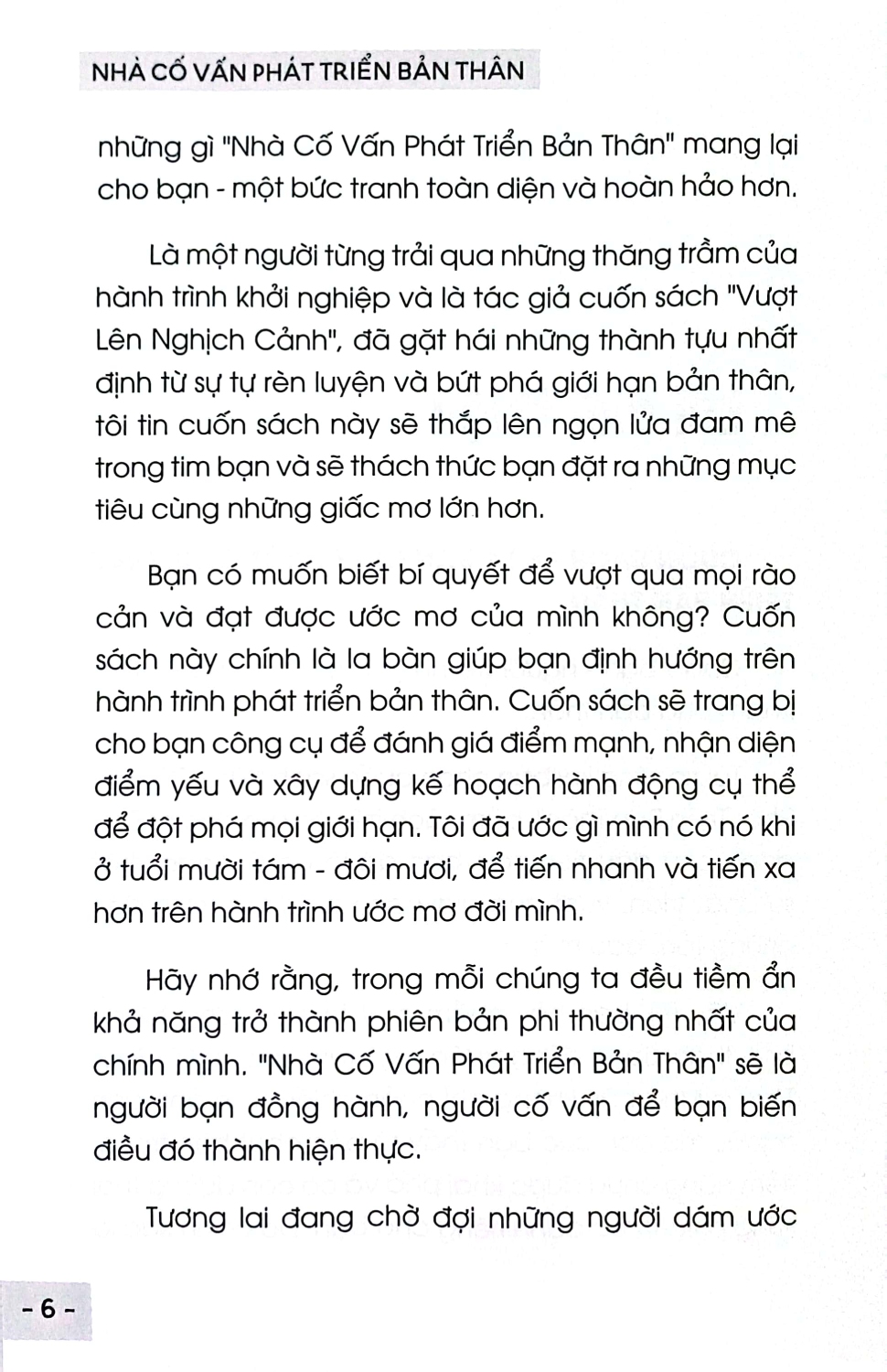 Nhà Cố Vấn Phát Triển Bản Thân (SB) Tiếp nối thành công của cuốn sách đầu tiên “NHÀ CỐ VẤN KHỞI NGHIỆP - Bí quyết trở thành nhà khởi nghiệp thành công và hạnh phúc”, Hội đồng Tư vấn và Hỗ trợ Khởi nghiệp phía Nam đã kết hợp cùng Công ty Cổ phần SBOOKS và Nhà xuất bản Văn Học, ra mắt quyển thứ 2 trong bộ sách “NHÀ CỐ VẤN”, với tên gọi “NHÀ CỐ VẤN PHÁT TRIỂN BẢN THÂN - 21 vấn đề và giải pháp giúp bạn trở thành phiên bản tốt nhất của chính mình”. Tại sao phải phát triển bản thân? Trong kỷ nguyên vươn mình của dân tộc, cơn sóng số hóa đã kéo theo một loạt những biến động của đời sống xã hội. Con người bị đặt vào thách thức mới: Làm thế nào để theo kịp vòng xoay nhanh chóng ấy? Làm thế nào để trở thành nhân sự ưu thế trong cuộc chiến tuyển dụng? Làm thế nào để sống cân bằng? Làm thế nào để trở thành con người ưu tú?... Vô vàn những câu hỏi được đưa ra, và nguồn chung của tất cả chúng là phải giải quyết được bài toán “thế hệ trẻ - thế hệ thanh niên cần gì và thiếu gì”. Đó chính là tất cả những nguyên nhân buộc phải đi đến kết quả “Phát triển bản thân”. Cuốn sách giúp gì trong hành trình này? Nếu như cuốn “NHÀ CỐ VẤN KHỞI NGHIỆP - Bí quyết trở thành nhà khởi nghiệp thành công và hạnh phúc” đưa ra những gợi ý, những giải pháp và cách thức để khởi nghiệp từ tâm thành công và hạnh phúc, thì phần tiếp nối là “NHÀ CỐ VẤN PHÁT TRIỂN BẢN THÂN - 21 vấn đề và giải pháp giúp bạn trở thành phiên bản tốt nhất của chính mình” sẽ tập trung vào 21 vấn đề và giải pháp giúp bạn định vị và hoàn thiện bản thân trong kỷ nguyên vươn mình này. Như bạn đã thấy ở đa số những cuốn sách kỹ năng, đó là người ta nói quá nhiều về lý thuyết mà không đưa ra thực hành, hoặc phổ biến hơn là cách dẫn dắt vấn đề ở dạng lý luận suông. “Nhà cố vấn phát triển bản thân” thì hoàn toàn khác biệt, vì nó như một bộ sưu tập các cuộc trò chuyện với các Mentor đa phong thái, đa lĩnh vực. Mỗi chương trong sách được viết theo cấu trúc quen thuộc của bộ sách “Nhà cố vấn”: đặt vấn đề - câu chuyện minh họa từ cuộc gặp gỡ thực tế giữa hai nhân vật mentor (người cố vấn) và mentee (người được cố vấn) - phân tích câu chuyện để đúc kết giải pháp. Điểm vô cùng đặc biệt là cuốn sách bám sát vào những tình huống thực tế của Mentor và Mentee, sau khi cung cấp giải pháp sẽ đưa ra những bài tập thực hành cho những cá nhân đang gặp vấn đề tương tự. Với 6 phần và 21 chương, cuốn sách này sẽ là người bạn đồng hành, giúp bạn khám phá và giải quyết những vấn đề cốt lõi trong việc xây dựng tầm nhìn, nhận thức và phát triển kỹ năng cần thiết để thành công. Từ việc trau dồi kiến thức đến việc hình thành thái độ tích cực và phong cách sống lành mạnh, mỗi chương đều được thiết kế để bạn có thể áp dụng vào cuộc sống thực tế và trở thành phiên bản tốt nhất của chính mình. Phần 1. Tầm nhìn định hướng tương lai: Giúp bạn xác định mục tiêu và phương hướng trong cuộc sống, đồng thời định vị bản thân và đưa ra lời tuyên ngôn thúc đẩy bản thân tiến xa hơn. Phần 2. Nhận thức xã hội - La bàn của sự phát triển: Nâng cao khả năng tự nhận thức bản thân cũng như nhận thức thế giới quan, nhân sinh quan xung quanh để bạn có những tư duy đúng đắn, quyết định cho thành công và hạnh phúc của bạn. Phần 3. Kiến thức - Nền tảng của thành công: Giúp bạn nhận diện những sai lầm thường mắc phải trong quá trình học hỏi, từ đó xác định phương pháp cập nhật kiến thức một cách hiệu quả. Phần 4. Kỹ năng - Công cụ kết nối thế giới: Phát triển các kỹ năng thiết yếu trong kỷ nguyên số và ứng dụng nó một cách linh hoạt trong công việc và cuộc sống. Phần 5. Thái độ quyết định con người bạn: Xác định thái độ sống và làm việc tích cực để hành trình cuộc sống trở nên thuận lợi và tốt đẹp hơn. Phần 6. Phong cách sống để có một cuộc đời hạnh phúc: Định hình lối sống lành mạnh và cân bằng. Phần kết - Kế hoạch hành động: Với những phần trên, bạn có thể đọc từ bất kỳ chương nào, có thể làm bất kỳ bài tập nào mà bạn cảm thấy hứng thú. Nhưng riêng phần kết này, bạn cần phải đọc xong 21 chương của sách thì mới đọc và thực hành được. Vì nó là phần hướng dẫn bạn lập bản kế hoạch phát triển bản thân chi tiết và linh hoạt sử dụng theo mục tiêu cá nhân của từng giai đoạn cuộc đời. Cuốn sách kỳ vọng trở thành nguồn cảm hứng cho những tâm hồn trẻ đang tìm kiếm lối đi riêng mình. Đặc biệt với các bạn trẻ vừa mới gia nhập thị trường lao động khắc nghiệt, những sinh viên đang đứng trước ngưỡng cửa cuộc đời, việc xác định phương hướng và phát triển bản thân là một nhiệm vụ đầy thách thức nhưng