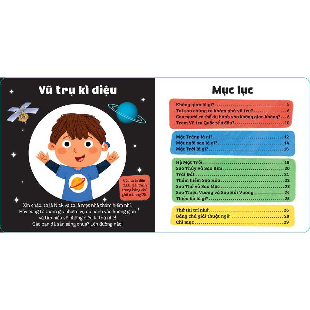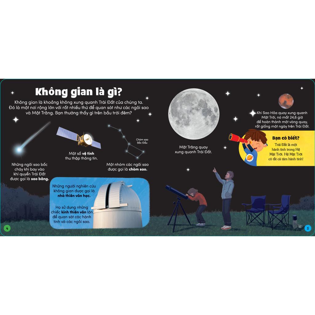 Cuốn sách sẽ giới thiệu cho bé những thông tin quan trọng như các hành tinh, những ngôi sao, thám hiểm không gian và nhiều điều hấp dẫn khác nữa. Phụ huynh hãy cùng bé bước vào một thế giới bên ngoài Trái Đất nhé!