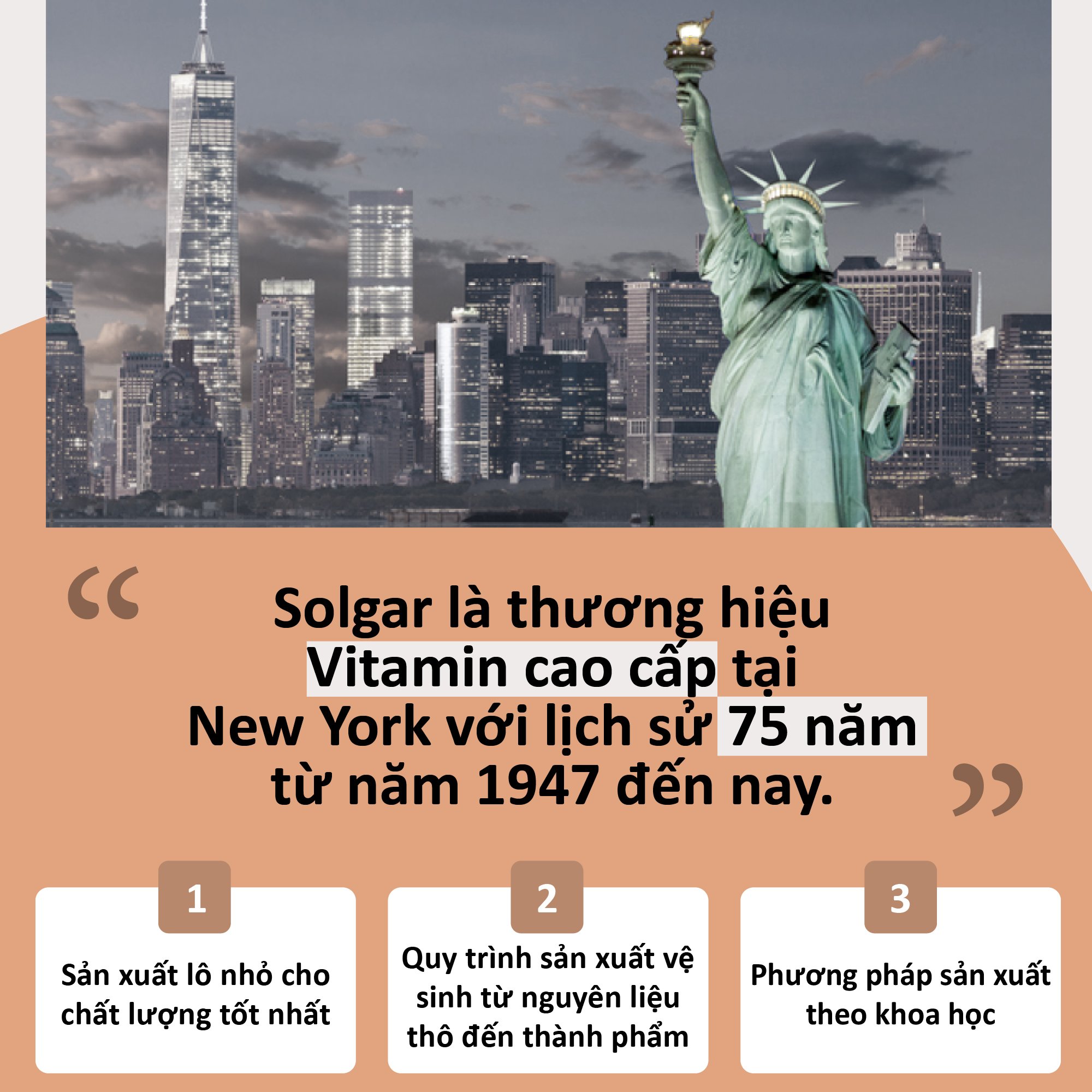 Chỉ những nguyên liệu đạt chất lượng tốt nhất mới được Solgar sử dụng cho quá trình sản xuất. Tất cả nguyên liệu trước khi đưa vào cơ sở của Solgar đều phải trải qua bước kiểm tra nghiêm ngặt để đảm bảo chất lượng cao nhất. Nếu các nguyên liệu không đáp ứng được các yêu cầu của Solgar, Solgar sẽ từ chối và trả lại cho nhà cung cấp. Solgar có Phòng Kiểm tra chất lượng tại chỗ nhằm đảm bảo tất cả sản phẩm đều đạt Tiêu Chuẩn Vàng về chất lượng trước khi phân phối đến khách hàng.
