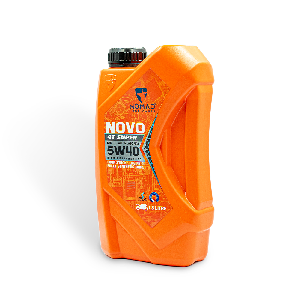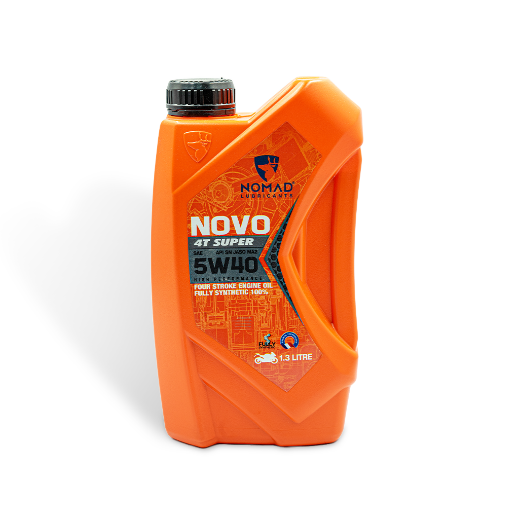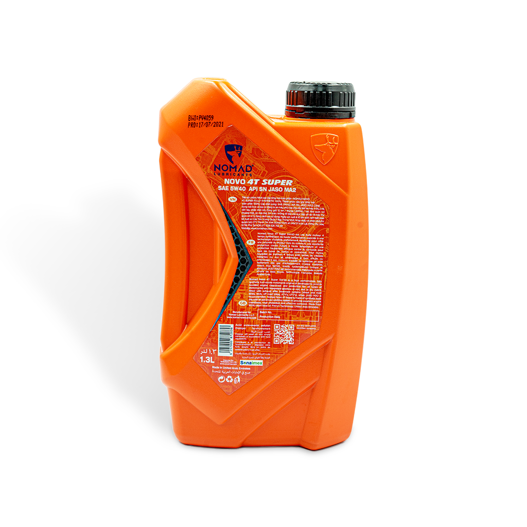 Nhớt tổng hợp toàn phần 100% NOMAD - SAE 5W40 - API SN - JASO MA2 – 1.3L Dầu nhớt xe máy nhập khẩu Dubai – Tổng hợp toàn phần 100% Chuyên dụng dành cho xe côn tay, xe phân khối lớn: Suzuki Satria F150, R150, Suzuki GSX 150 Bandit, GSX-R150, GSX-S150, Honda CB150R Exmotion,…    GIỚI THIỆU SẢN PHẨM: Nomad Super 4T – 1.3L là dòng sản phẩm nhớt động cơ tổng hợp toàn phần 100% chuyên dụng dành cho xe côn tay. Sản phẩm được sản xuất từ dầu gốc nhóm IV và các loại phụ gia cao cấp giúp sản phẩm đạt chuẩn chất lượng cao nhất hiện nay. Đặc biệt, dòng nhớt có màu xanh dạ quang bắt mắt.   DUNG TÍCH ĐẶC BIỆT, THÊM SỰ LỰA CHỌN Với nhớt Nomad Novo 4T Super 1.3L tổng hợp toàn phần, giờ đây khách hàng sẽ có thêm sự lựa chọn khi sử dụng cho xe máy có dung tích bình nhớt 1.3 lít. Thiết kế bao bì chai cứng cáp, Nomad Novo 4T Super 1.3L mang lại sự cao cấp, sự bắt mắt và hiện đại khi được trưng bày. LỢI ÍCH SẢN PHẨM: