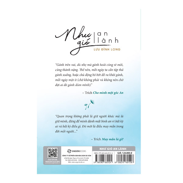 Tựa sách Như gió an lành cũng chính là lời chia sẻ chân thành của tác giả Lưu Đình Long: chỉ cần học cách thương yêu, thương yêu cho sâu sắc, thì tự nhiên mình sẽ biết buông bỏ những hoài nghi, những tham muốn chiếm hữu, cũng như sẽ biết tùy duyên, tùy thuận chứ không cưỡng cầu, trói buộc,… Tự do, an lành như là gió!