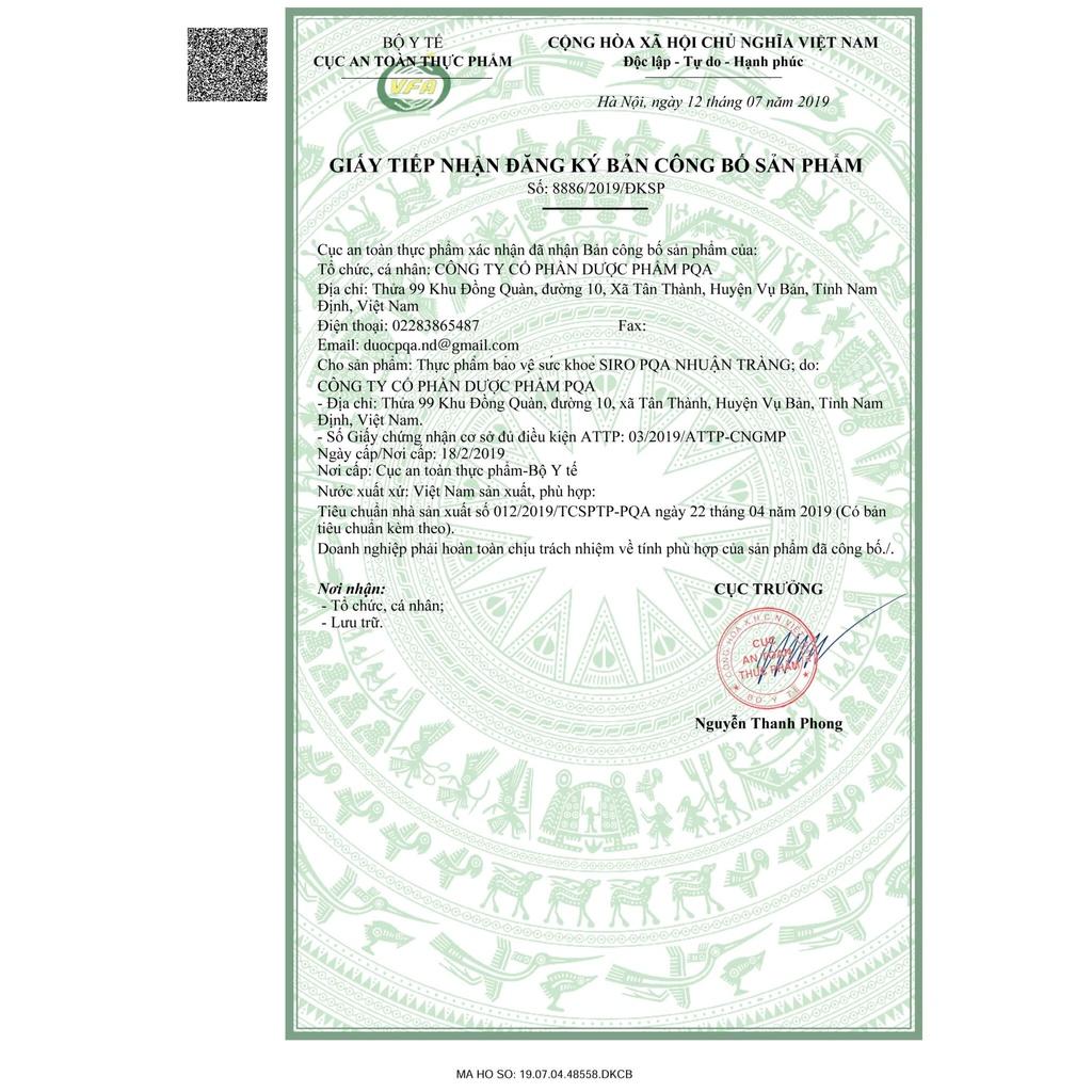 - Địa chỉ sản xuất: Công ty Cổ phần Dược phẩm PQA. Thửa 99, Khu Đồng Quàn, Xã Tân Thành, Huyện Vụ Bản, Tỉnh Nam Định. THÀNH PHẦN: