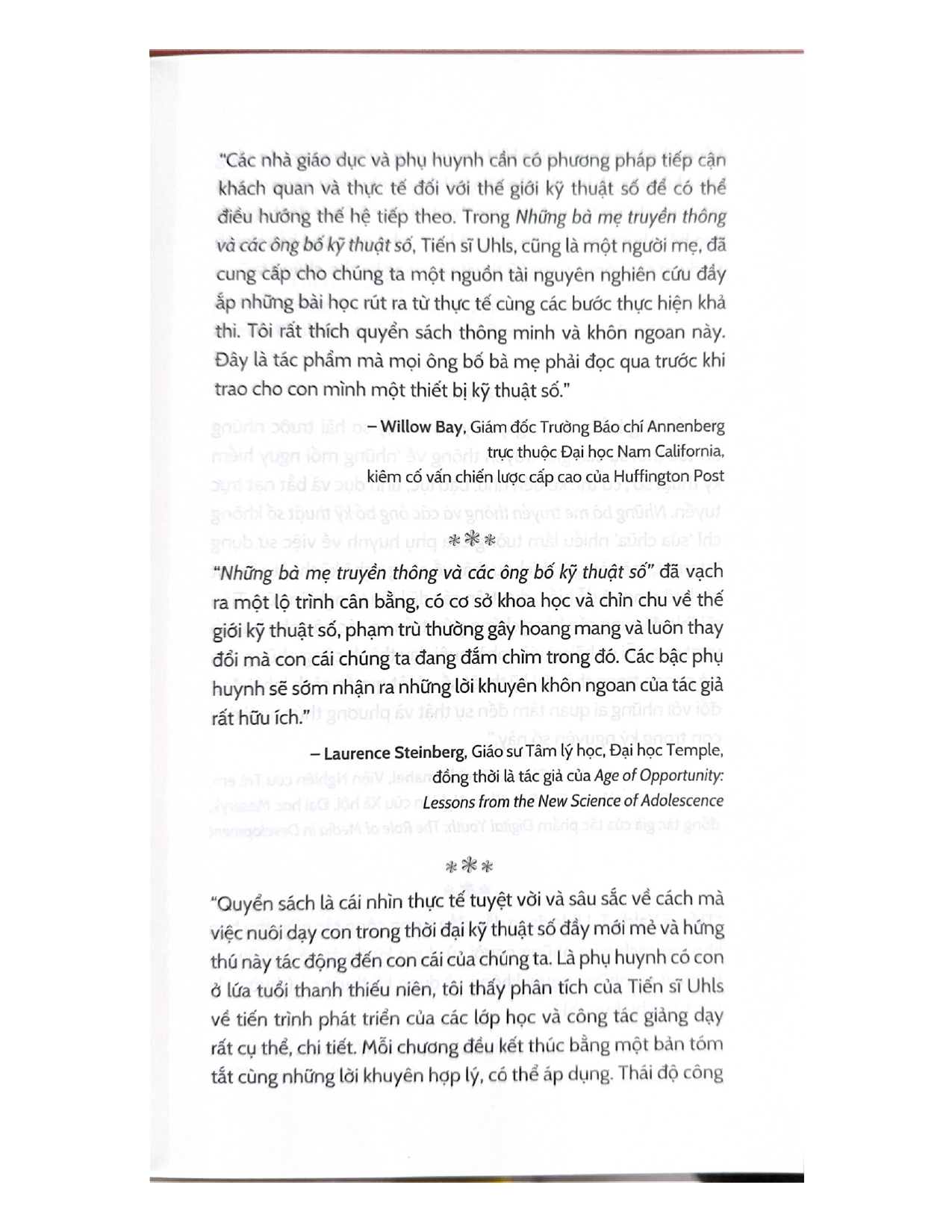- Giới thiệu Những Bà Mẹ Truyền Thông Và Các Ông Bố Kỹ Thuật Số “Nhiều ông bố bà mẹ ngày nay cảm thấy sợ hãi trước những tin tức thời sự của giới truyền thông về “những mối nguy hiểm kỹ thuật số” như: bạo lực, tình dục và bắt nạt trực tuyến. Những bà mẹ truyền thông và các ông bố kỹ thuật số không chỉ “sửa chữa” nhiều lầm tưởng của phụ huynh về việc sử dụng Internet, mà còn giải thích sự thật về công nghệ kỹ thuật số một cách rõ ràng và dễ hiểu. Dựa trên các dữ kiện nghiên cứu, Tiến sĩ Uhls đã cung cấp bằng chứng giúp trấn an các bậc phụ huynh vượt qua nỗi sợ về việc phải nuôi dạy thành công những đứa trẻ ngoan trong thời đại kỹ thuật số. Đây là quyển sách “phải đọc” với những ai quan tâm đến sự thật và phương thức nuôi dạy con cái trong kỷ nguyên số này.”