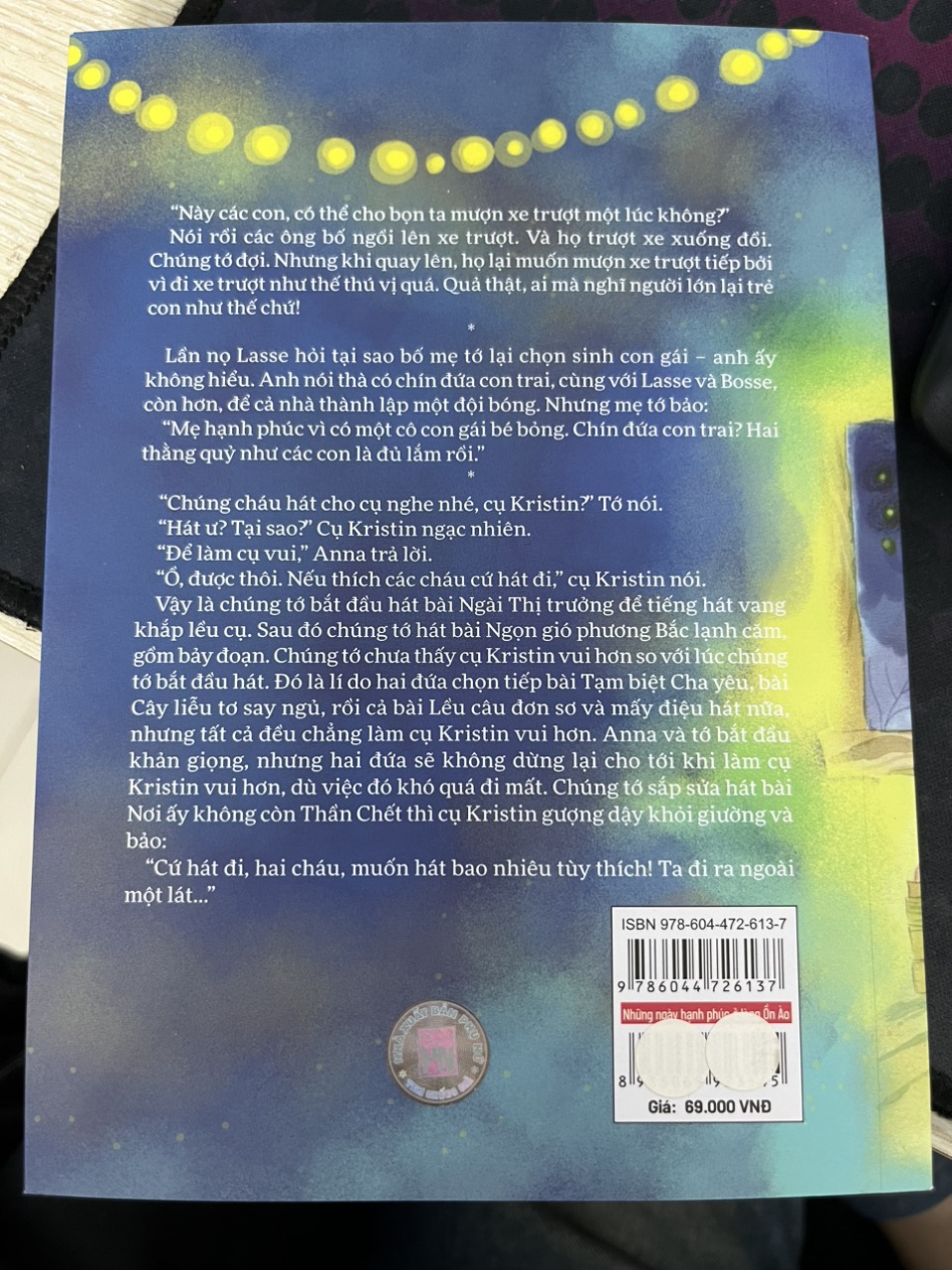 "Này các con, có thể cho bọn ta mượn xe trượt một lúc không?" Nói rồi các ông bố ngồi lên xe trượt. Và họ trượt xe xuống đồi. Chúng tớ đợi. Nhưng khi quay lên, họ lại muốn mượn xe trượt tiếp bởi vì đi xe trượt như thế thú vị quá. Quả thật, ai mà nghĩ người lớn lại trẻ con như thế chứ! Lần nọ Lasse hỏi tại sao bố mẹ tớ lại chọn sinh con gái - anh ấy không hiểu. Anh nói thà có chín đứa con trai, cùng với Lasse và Bosse, còn hơn, để cả nhà thành lập một đội bóng. Nhưng mẹ tớ bảo: "Mẹ hạnh phúc vì có một cô con gái bé bỏng. Chín đứa con trai? Hai thằng quỷ như các con là đủ lắm rồi." * "Chúng cháu hát cho cụ nghe nhé, cụ Kristin?" Tớ nói. "Hát ư? Tại sao?" Cụ Kristin ngạc nhiên. "Để làm cụ vui," Anna trả lời. "Ô, được thôi. Nếu thích các cháu cứ hát đi," cụ Kristin nói. Vậy là chúng tớ bắt đầu hát bài Ngài Thị trưởng để tiếng hát vang khắp lều cụ. Sau đó chúng tớ hát bài Ngọn gió phương Bắc lạnh căm, gồm bảy đoạn. Chúng tớ chưa thấy cụ Kristin vui hơn so với lúc chúng tớ bắt đầu hát. Đó là lí do hai đứa chọn tiếp bài Tạm biệt Cha yêu, bài Cây liễu tơ say ngủ, rồi cả bài Lêu câu đơn sơ và mấy điệu hất nữa, nhưng tất cả đều chẳng làm cụ Kristin vui hơn. Anna và tớ bắt đầu khản giọng, nhưng hai đứa sẽ không dừng lại cho tới khi làm cụ Kristin vui hơn, dù việc đó khó quá đi mất. Chúng tớ sắp sửa hát bài Nơi ấy không còn Thần Chết thì cụ Kristin gượng dậy khỏi giường và bảo: "Cứ hát đi, hai cháu, muốn hát bao nhiêu tùy thích! Ta đi ra ngoài một lá"