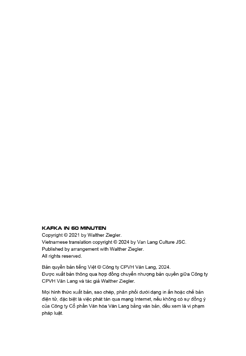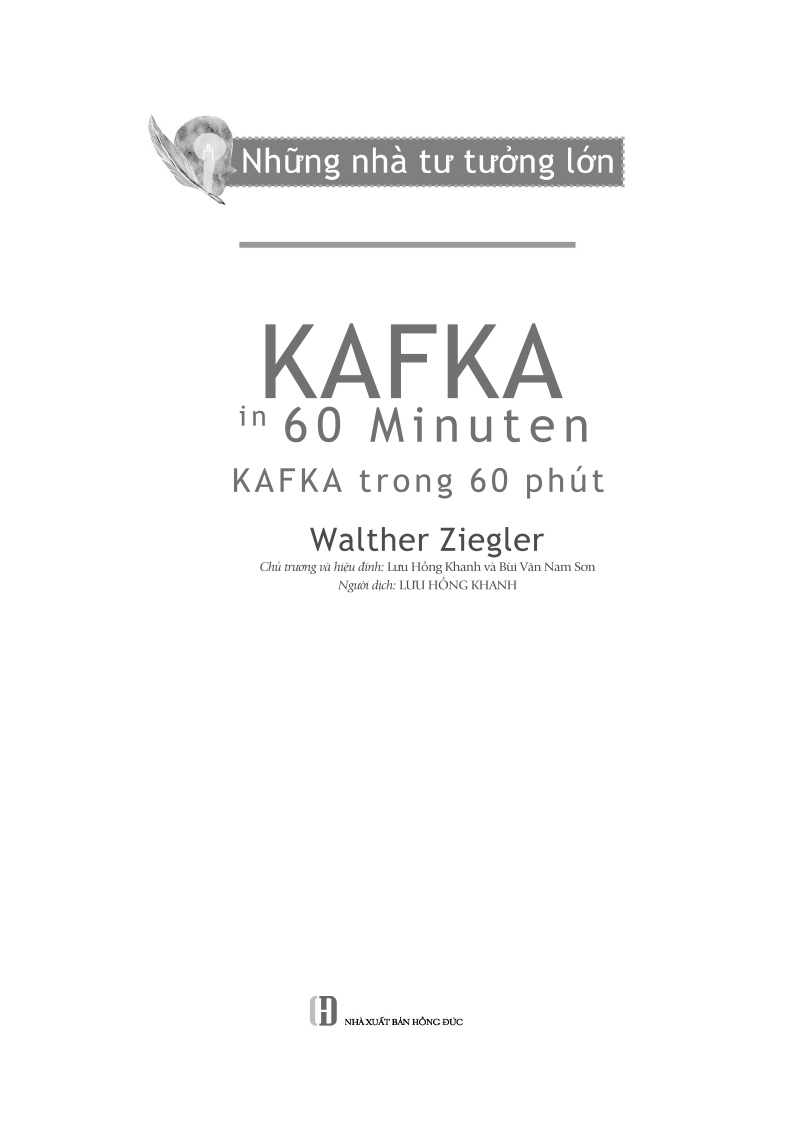 - Giới thiệu Những Nhà Tư Tưởng Lớn - Kafka In 60 Minuten - Kafka Trong 60 Phút Kafka là nhà văn tiếng Đức rất được yêu thích trên cả thế giới. Chúng ta ghi ơn ông không chỉ vì các tác phẩm của ông là một phần văn chương thế giới xuất sắc, mà còn bởi chúng là một khám phá triết học rộng lớn. Trong các truyện thuyết của mình, ông đã đưa đến cho ta một thức nhận sâu xa đi vào trong những vực thẳm, cùng với cái cấu trúc cơ bản về mối tương quan liên nhân. Không một ai có thể bàng quan trước những miêu tả và truyện thuyết của ông [...] một cuốn sách phải là cái rìu chặt chém tan vỡ cái biển nước đông cứng giá lạnh trong ta. “Triết học cho mọi người! Bộ sách Những nhà tư tưởng lớn lần đầu tiên trình bày sâu sắc công trình của các nhà triết học quan trọng nhất: Dễ hiểu, thú vị và rất thời sự.” - Martin Politowski “Kafka là một người đứng trước ngưỡng cửa hạnh phúc, nhưng suốt đời ông lại đã ở rất xa mảnh đất ước mong này. Cuốn sách viết về Kafka ở đây là một cuộc du hành khai phá. Với năm truyện thuyết của Kafka, ta có thể đi đến cốt lõi sự nghiệp triết học của ông và cuối cùng nhìn ra được chính mình ở trong đó.” – Ipek Demirtas