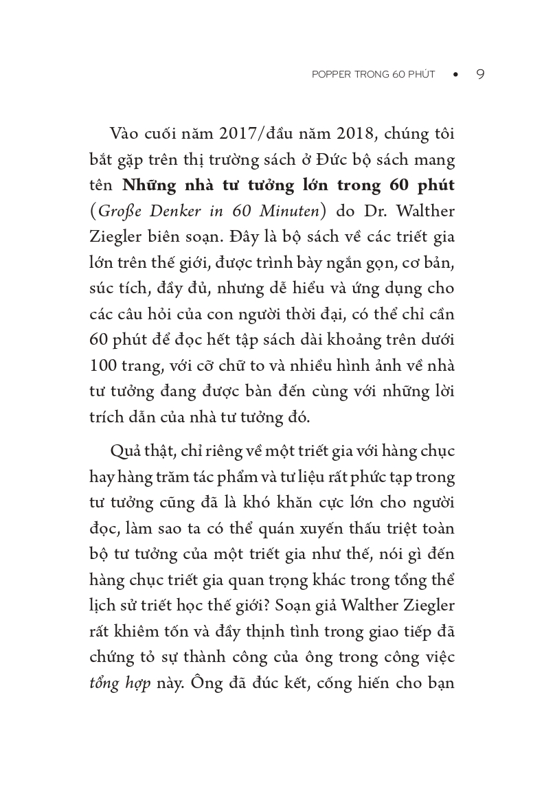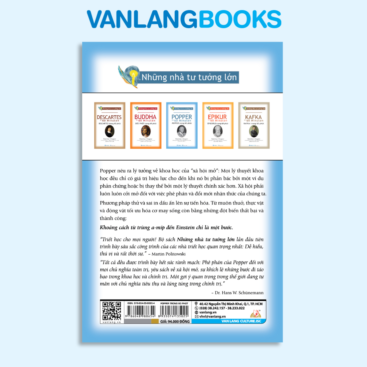 - Giới thiệu Những Nhà Tư Tưởng Lớn - Popper In 60 Minuten - Popper Trong 60 Phút Popper nêu ra lý tưởng về khoa học của “xã hội mở“: Mọi lý thuyết khoa học đều chỉ có giá trị hiệu lực cho đến khi nó bị phản bác bởi một ví dụ phản chứng hoặc bị thay thế bởi một lý thuyết chính xác hơn. Xã hội phải luôn luôn cởi mở đối với việc phê phán và đổi mới nhận thức của chúng ta Phương pháp thử và sai in dấu ấn lên sự tiến hóa. Từ muôn thuở, thực vật và động vật tối ưu hóa cơ may sống còn bằng những đột biến thất bại và thành công: Khoảng cách từ trùng a-míp đến Einstein chỉ là một bước. Triết học cho mọi người! Bộ sách Những nhà tư tưởng lớn lần đầu tiên trình bày sâu sắc công trình của các nhà triết học quan trọng nhất: Dễ hiểu, thú vị và rất thời sự.” – Martin Politowski “Tất cả đều được trình bày hết sức rành mạch: Phê phán của Popper đối với mọi chủ nghĩa toàn trị, yêu sách về xã hội mở, sự khích lệ những bước đi táo bạo trong khoa học và chính trị. Một gợi ý quan trọng trong thế giới đang tự mãn với chủ nghĩa tiêu thụ và lúng túng trong chính trị.”