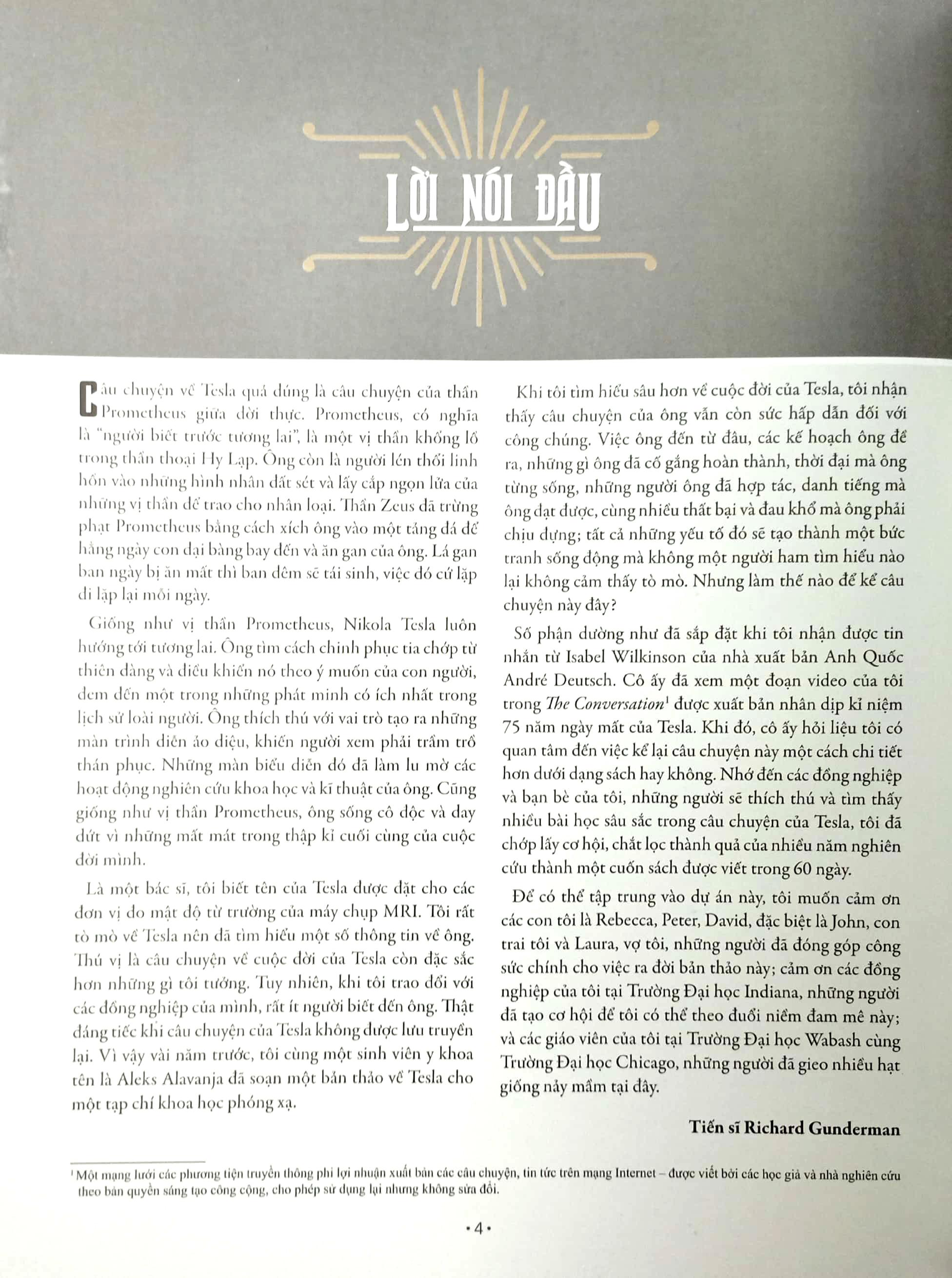 Từ tia X, ra-đa đến cuộn dây Tesla, radio, điều khiển từ xa, cuốn tiểu sử với 150 bức ảnh minh họa tuyệt đẹp này sẽ cho độc giả thấy được sự phát triển trong các lý thuyết chính và phát minh của Tesla. Cuốn sách làm sáng tỏ những góc tối trong cuộc đời riêng tư và sự nghiệp của nhà phát minh đại tài, người đã sống một cuộc đời lập dị và cô độc, dù đã đóng góp đáng kể cho văn minh nhân loại. Tesla bao gồm những bức vẽ, lá thư, nhật kí, ghi chép hiếm hoi của Tesla, cùng với những bức ảnh chụp ông, tất cả tạo nên bức chân dung hoàn chỉnh về một trí tuệ vĩ đại trong lịch sử.