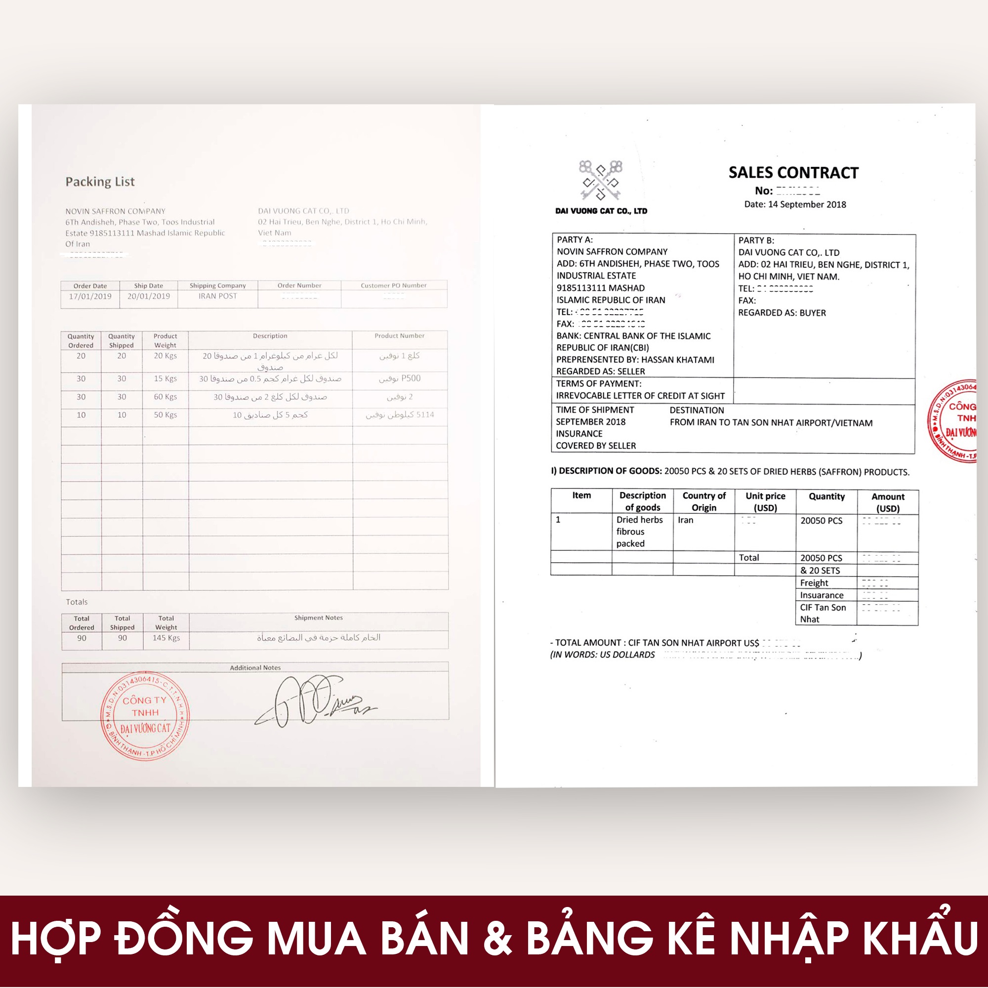 - CO/CQ (Certificate of Origin): giấy chứng nhận xuất xứ tại Iran do Bộ Công Thương, Công - Nông nghiệp Iran xác nhận