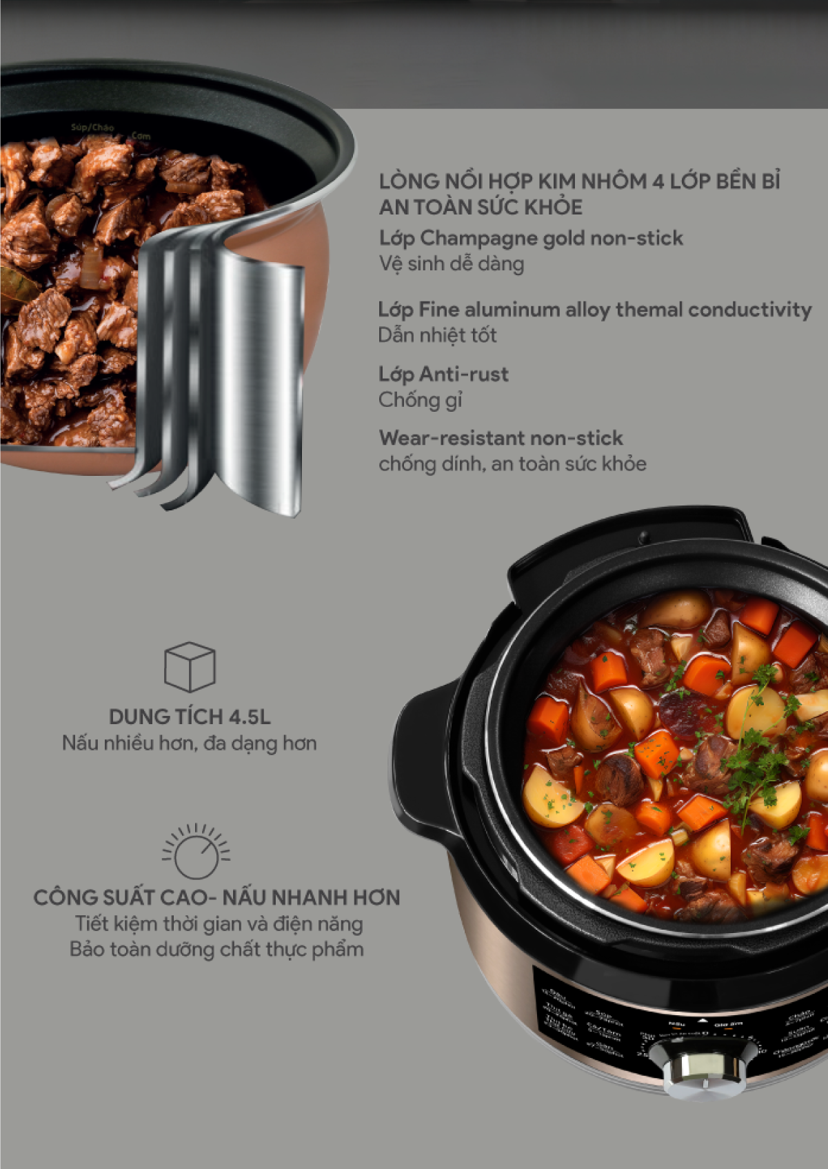 Đặc điểm nổi bật - Nồi áp suất đa chức năng : nấu cơm, nấu cháo, hầm gân, ninh, súp, hấp, giữ ấm - Dung tích : 5.0 lít phù hợp gia đình 4 - 6 người.