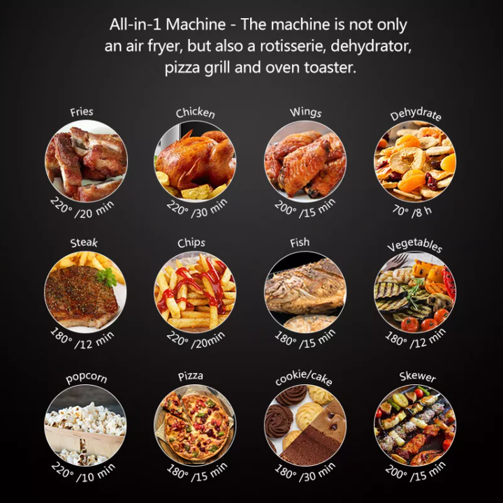 Nồi chiên không dầu dung tích 12 lít công suất 1500W • Phù hợp với nhiều thực đơn & nhu cầu nấu nướng lớn • Tích hợp quạt đối lưu và chức năng quay: Giúp