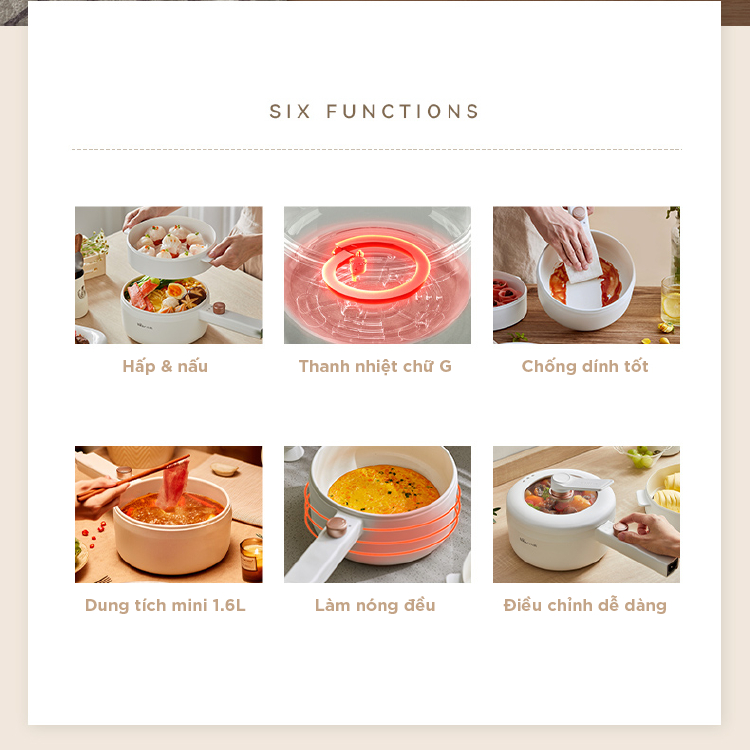 Nồi điện đa năng Bear MC-4H16G là giải pháp nấu nướng hoàn hảo cho người độc thân, sinh viên và các cặp đôi. Với dung tích 1.6L nhỏ gọn, cùng với đó là nhiều tính năng