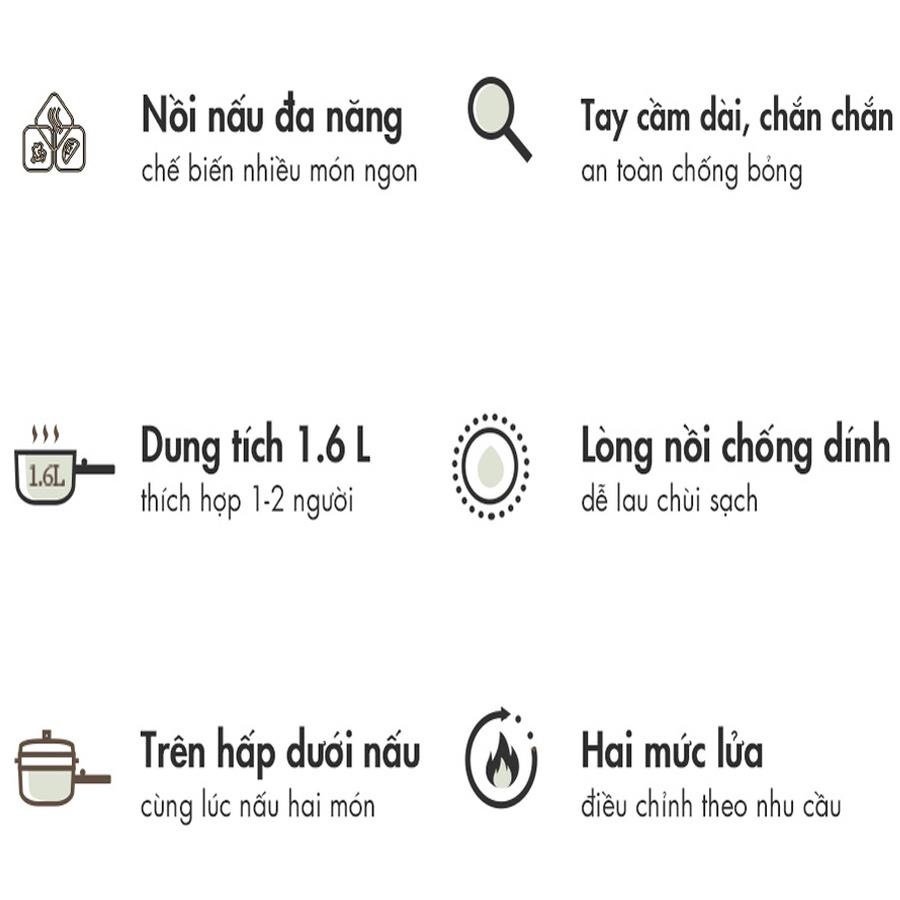 Mua tại TiktokDung tích 1.6L, phù hợp 1-2 người Đa năng: Nồi lẩu điện đa năng có thể làm các món: hấp, lẩu, xào, luộc, An toàn: Tính năng bảo vệ đoản mạch khi nhiệt độ cao ở bếp điện; tay cầm nồi cách nhiệt, lòng nồi tráng men CERAMIC THÔNG SỐ KỸ THUẬT