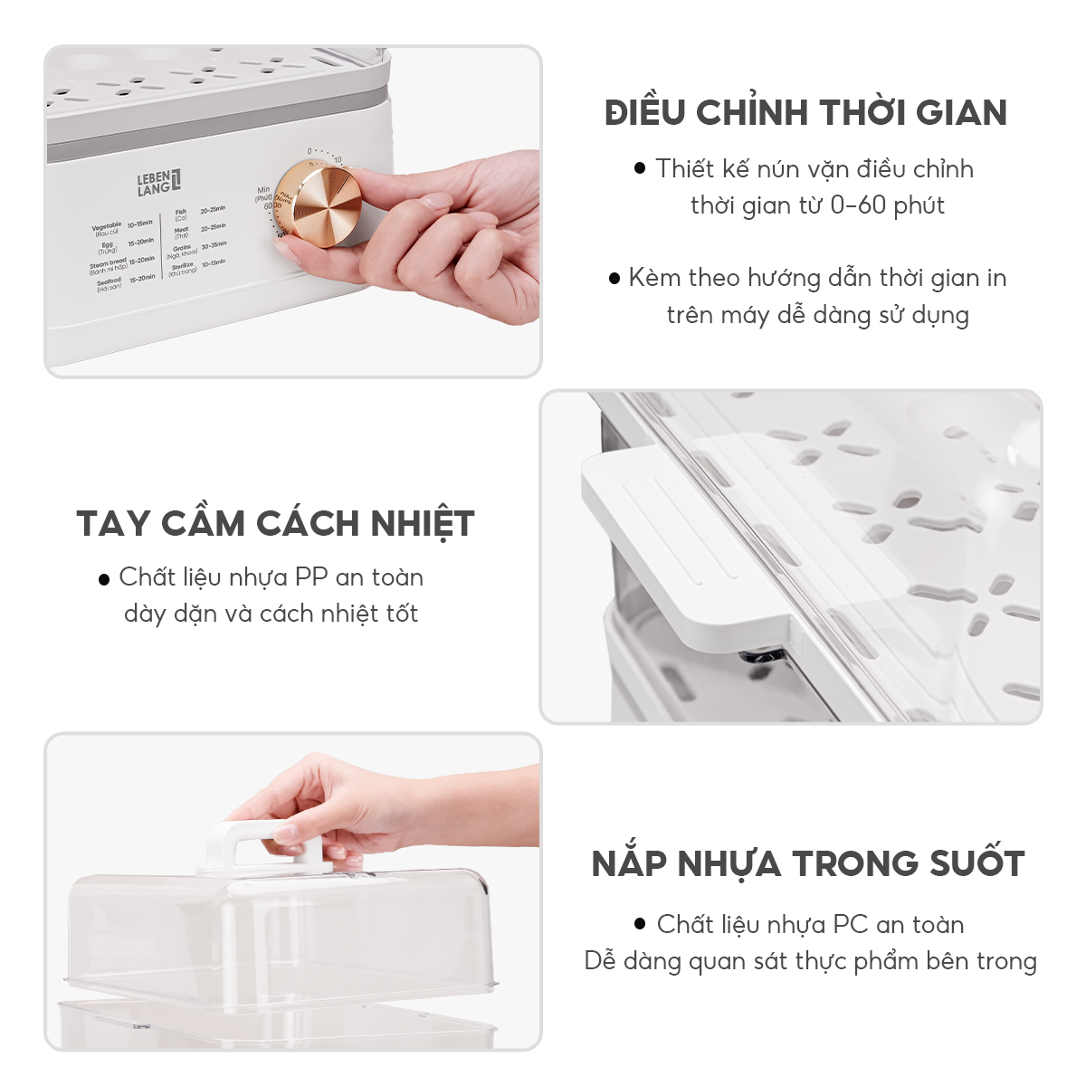 - Đa Chức Năng: Nồi hấp Lebenlang không chỉ hấp đơn thuần mà còn có chức năng hâm nóng, hẹn giờ, phù hợp với nhiều nhu cầu sử dụng khác nhau trong gia đình.