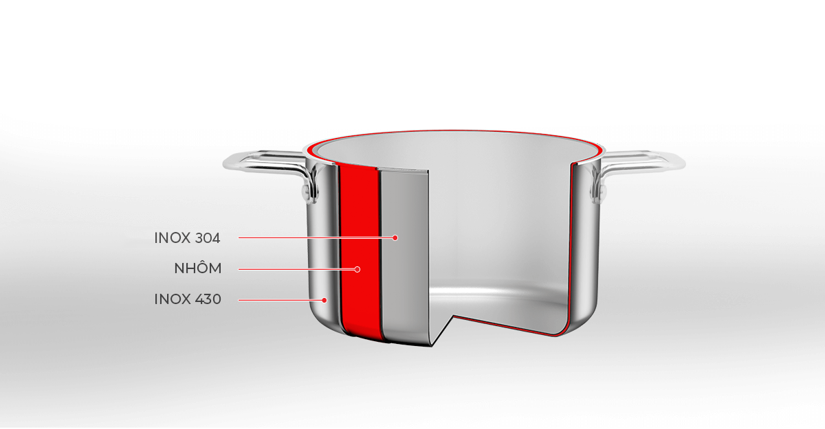 Lớp ngoài cùng tiếp xúc với mặt bếp là inox 430 cho hiệu suất bắt từ lên đến 98%, giúp tiết kiệm nhiên liệu tối đa khi nấu.