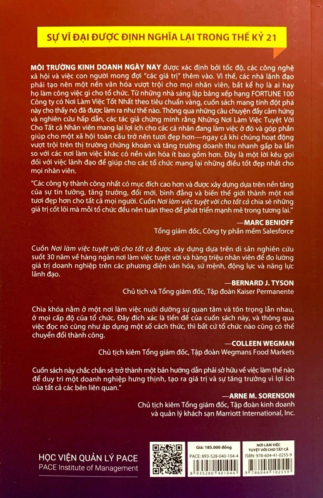 Nơi làm việc tuyệt vời cho tất cả là một cuốn sách mang tính đột phá, bàn về việc làm sao xây dựng nơi làm việc trở thành một nơi làm việc tuyệt vời cho tất cả. Nó cung cấp những chi tiết cụ thể về cách thực hiện những thay đổi cần thiết nhằm cải thiện không chỉ hiệu quả lãnh đạo và sự hài lòng của nhân viên mà còn cả về lợi nhuận. Thông qua những câu chuyện đầy cảm hứng và nghiên cứu hấp dẫn, các tác giả chứng minh rằng những công ty có nơi làm việc tuyệt vời cho tất cả đều mang lại lợi ích cho các cá nhân làm việc ở đó và đóng góp cho một xã hội toàn cầu tốt đẹp hơn - ngay cả khi những công ty này vẫn hoạt động tốt trên thị trường chứng khoán và tăng doanh thu nhanh gấp ba lần so với các công ty đối thủ.
